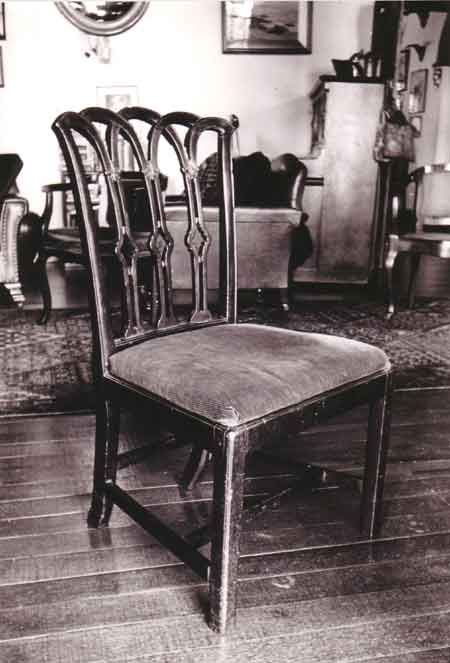 From the Pearse Collection: photograph depicting a chair in the Chippendale taste, with the backsplats forming decorative hoops. The seat is upholstered in velvet, and the legs are straight. Photograph probably considered for prof. Geoffrey Pearse's book "Eighteenth Century Furniture in South Africa", but never included.