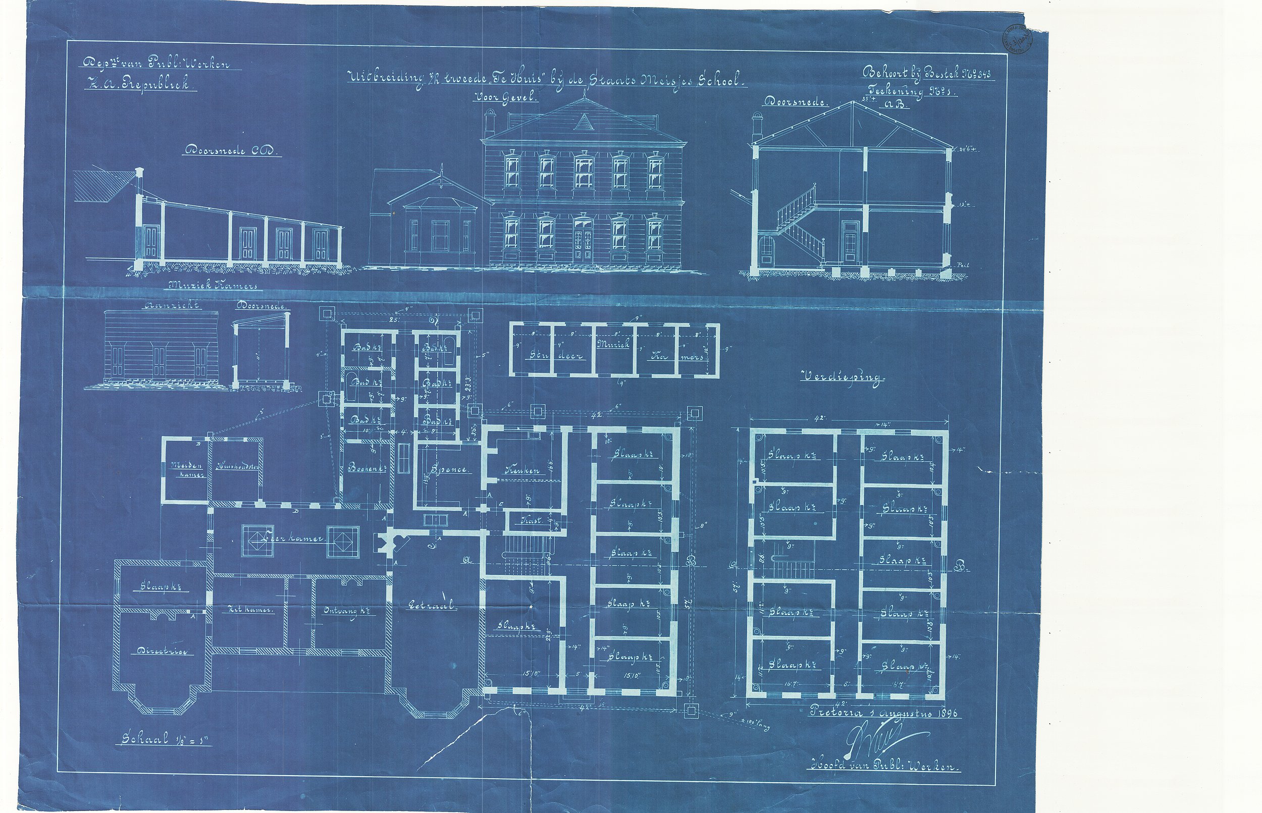 Digitised version of National Archive file S.3/1202. "Voorgevel, Doorsnede, Muziekkamers, Verdieping" (Front Gable, Section, Music Rooms, Storey), additions to the second building, Staats Meisjesschool, Pretoria, signed by "S.W. Wierda, Hoofd van Publieke Werken"
