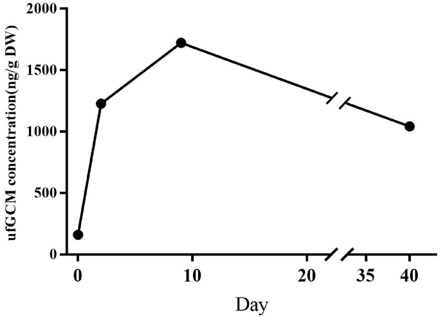 Therefore, the aim of this study was to test the stability of urofecal glucocorticoid metabolites (ufGCM) postdefecation, to determine time of day effects on ufGCM levels, and to investigate the effect of standard management procedures on ufGCM concentrations in broiler chickens.
