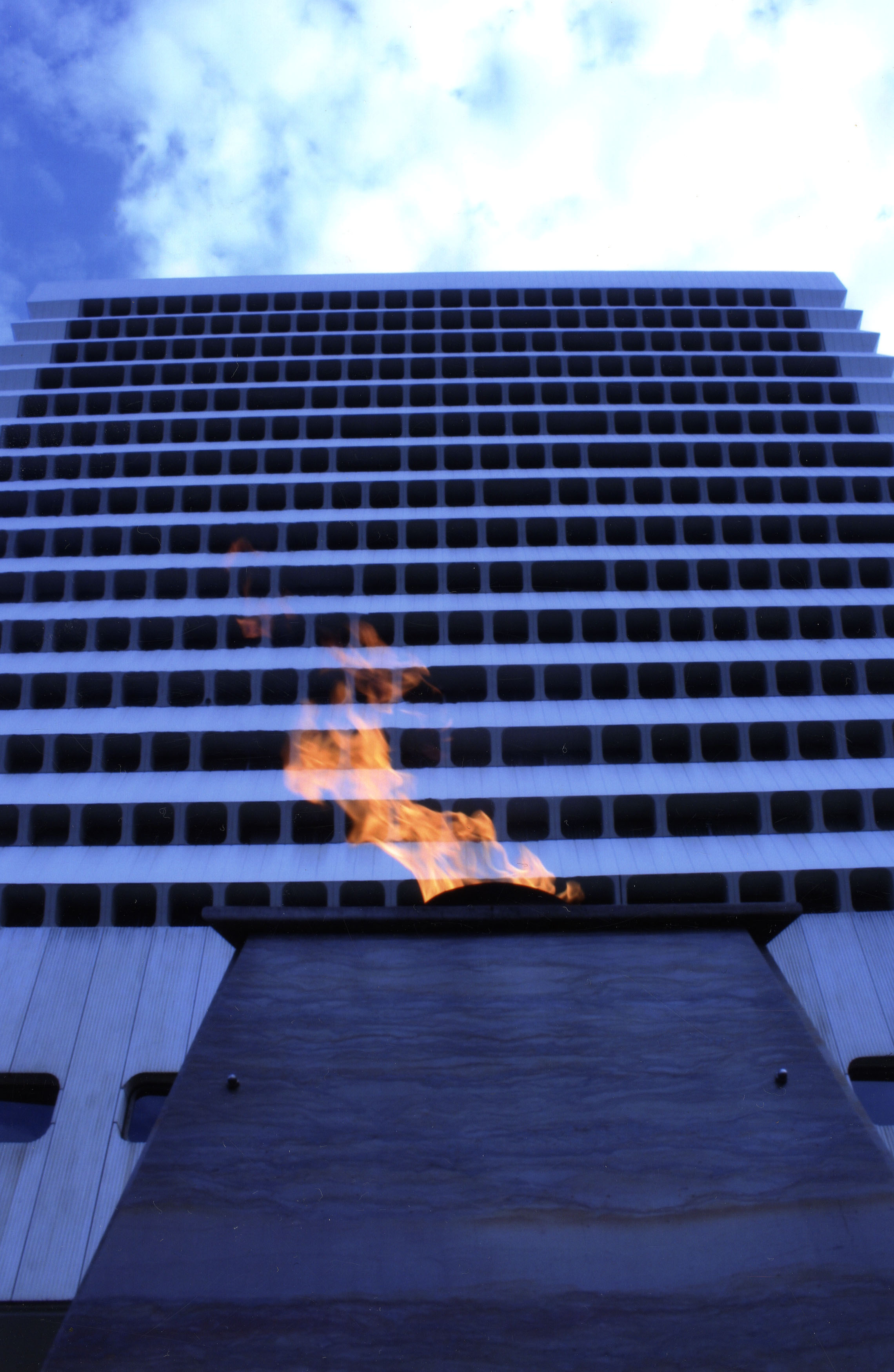 Angled view of the front of the Human Sciences Building with lit fire in front, Hatfield Campus, University of Pretoria