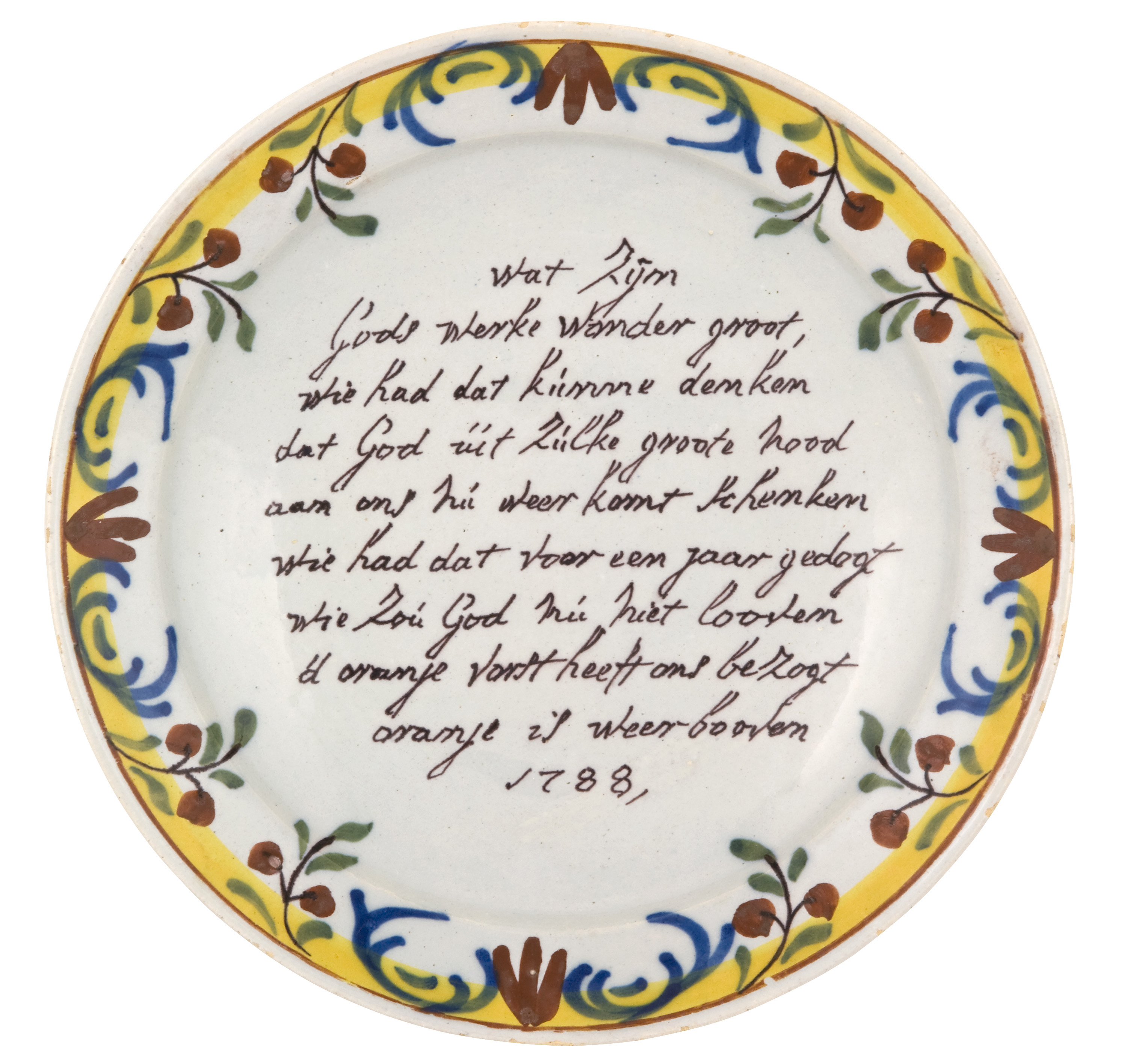 | dc.description | Round polychrome earthenware Delft plate. Decorated with orange green and blue floral sprigs on the cavetto and a poem of appraisal "Wat Zyn Gods werke wonder groot, wie had dat kunne denken dat God uit zulke groot nood aan ons Nu weer komt schenken wir had dat voor een jaar gedogt wie zou God nu niet loofen de oranje Vorst heeft ons bezogt oranje is weer boven 1788" central panel. Sunken, glazed unmarked base. The plate was used as propaganda material in 1788 to try and renew the faith of the people in the house of orange. | en_ZA |