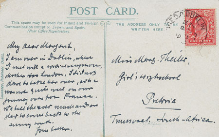 Postcard sent to Margaret, daughter of Sir Arnold Theiler, from her father from Dublin. Words on postcard: My dear Margaret, I am over in Dublin, where I met with [.....} Mother in London. I did not dare to take her overas she was not quite well on our journey from France. We felt the cold much and are glad to come back to the sunny South. From Father.