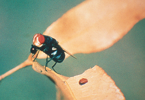 A blowfly in the process of regurgitating blood containing Bacillus anthracis on a leaf
