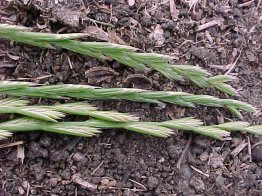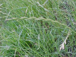 BOTANICAL DESCRIPTION: General: An annual, dense, tufted, soft grass. Leaves: The leaves are green and shiny and the culms usually unbranched. Flowers: The inflorescence is flat with the spikelets evenly arranged on either side of the central axis. The size of the awns is up to 10 mm, which distinguishes it from Lolium perenne.