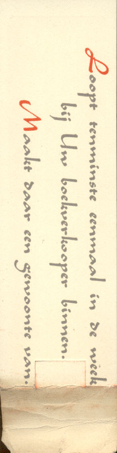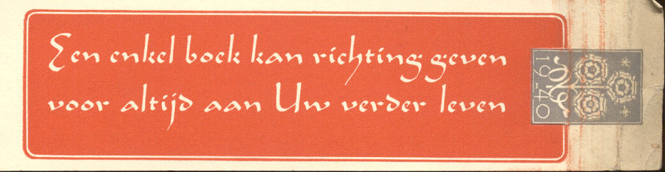 Book mark inscribed "Een enkel boek kan richting geven voor altijd aan Uw verder leven" 1940 with Boekenweek logo. Scanned on HP5300C scanner at 150dpi. Some damage at the one side due to a lot of bending.