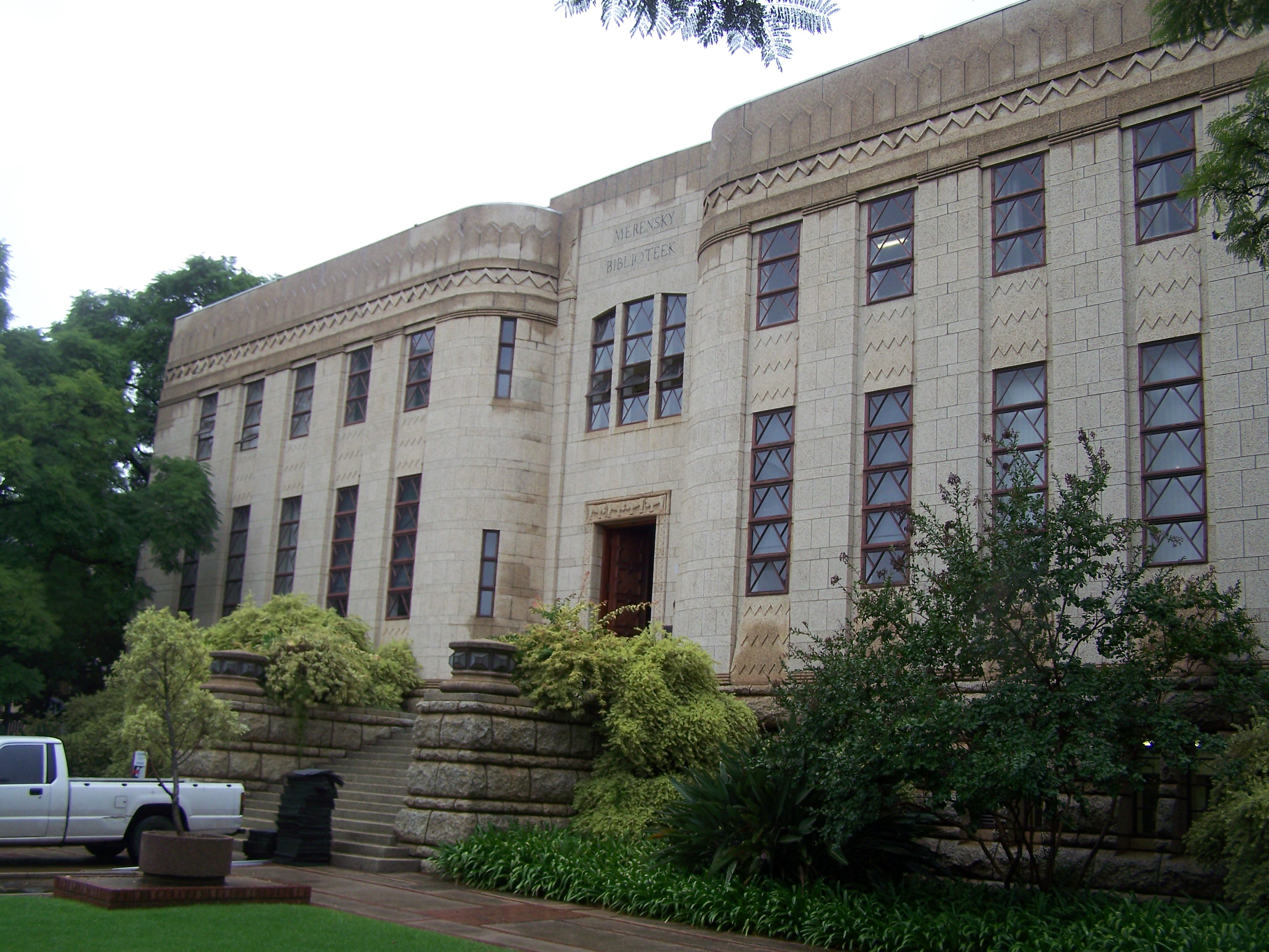 | dc.description.abstract | In 1933 it was decided by the University to construct a separate building for the library which was then still located in the Old Arts building. With a contribution of £10 000 from mining geologist Dr Hans Merensky, construction started in 1937. General Jan Smuts laid the cornerstone on 11 October 1937 and on 15 April 1938 the building was officially opened. “This country has given me so much that I am only too happy to be allowed to help it to develop and to be able to give back to it a fraction of what it has given to me...” - Hans Merensky, at the opening of the Merensky Library. In designing the building, architect Gerhard Moerdyk was influenced by various styles, including Art Deco, Neo-Classicism, Arts and Crafts, as well as local styles such as Cape Dutch and Regency. Moerdyk himself described the building as a study in Persian style, with influences from Africa including the Zimbabwe and ancient Egyptian ruins. He used local materials and incorporated symbols of African origin. The prominent zigzag pattern, for example, is taken from the Zimbabwe ruins and represents water and fertility, the crocodile as a water figure and the bird as a symbol of space, symbolizing the freedom and creativity of the author. The curving of the walls symbolises an open book. The green bevelled glass windows were imported from Italy and helped to minimise heat from the sun and also protected paper against ultraviolet light. The design of the building is a source of controversy and speculation with some claiming that Moerdyk used it as a practice run for the design of the Voortrekker Monument, as there are many similarities between the two buildings. Today this national monument serves as the Edoardo Villa museum and also houses amongst others, a Mimi Coertse, Marita Napier and the largest South African sheet music collections. | en |