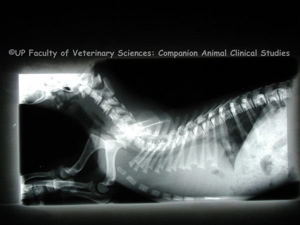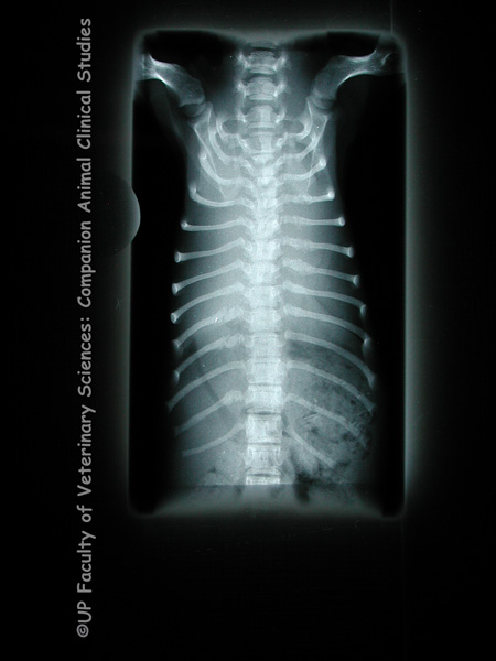 PHOTOS 1,2: Diaphragmatic hernia is the protrusion of abdominal organs into the thoracic cavity through an abnormal opening in the diaphragm. Diaphragmatic hernia may be congenital or acquired as a result of blunt trauma due to being hit by a car, high-rise syndrome, fighting, dog attacks. It may also be iatrogenic. Clinical signs include respiratory distress, borborygmus over the chest, asymmetrically quiet heart or lung sound and failure to distinguish between organs when the abdomen is palpated. Thoracocentesis and gastrocentesis may be done to relieve the dyspnoea. Immediate surgical correction is needed if the stomach has herniated, the bowel or organs are strangulated, the viscera have ruptured or if there is an inability to oxygenate after medical treatment. A traumatic diaphragmatic hernia is caused by an abrupt increase in intra abdominal pressure due to a forceful blow to the abdominal wall. The lungs then deflate rapidly resulting in a pleuroperitoneal gradient which causes the diaphragm to rupture at its weakest points. Congenital diaphragmatic hernias are due to dysfunctional development during embryogenesis. The defect causing the hernia may arise due to prenatal injury to the septum transversum or faulty development thereof. PHOTOS 3,4: Radiographic imaging may be necessary to confirm a diagnosis of a diaphragmatic hernia. In these radiographs of a Dachshund puppy, gas-filled loops of bowel can be seen crossing the diaphragm.