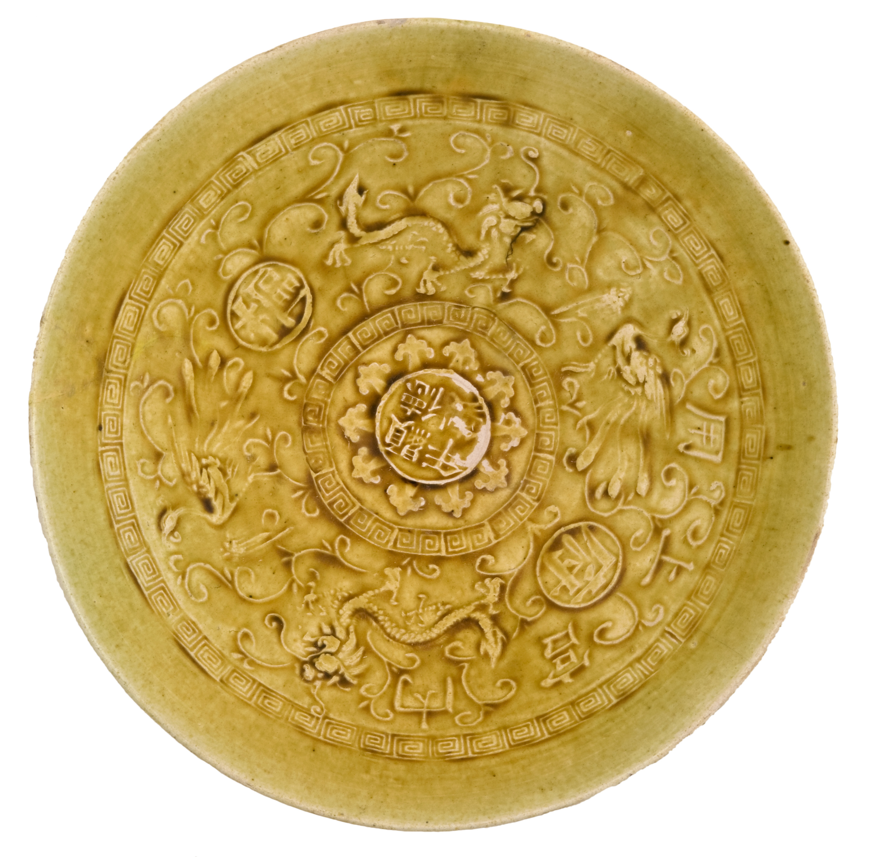 This very finely potted conical shaped bowl, resting on a neatly finished low circular foot rim is decorated with a central florette containing the reign mark Xiande nian zhi (954-960) below crisply moulded dragons amongst flowering branches of peony, all beneath a key-fret border. The bowl is covered inside and out, and underneath the base with a rich egg-yolk yellow glaze, pooling in the recessed areas.