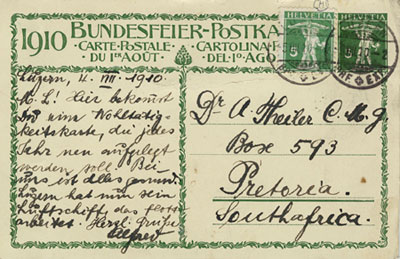 Postcard sent to Dr Arnold Theiler from his brother Alfred, posted from Luzern, Switzerland on the 4th August 1910. Words on postcard: