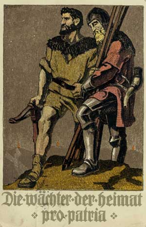 On front an image of two men. At bottom the words: Die wärhter der heimat pro-patria.