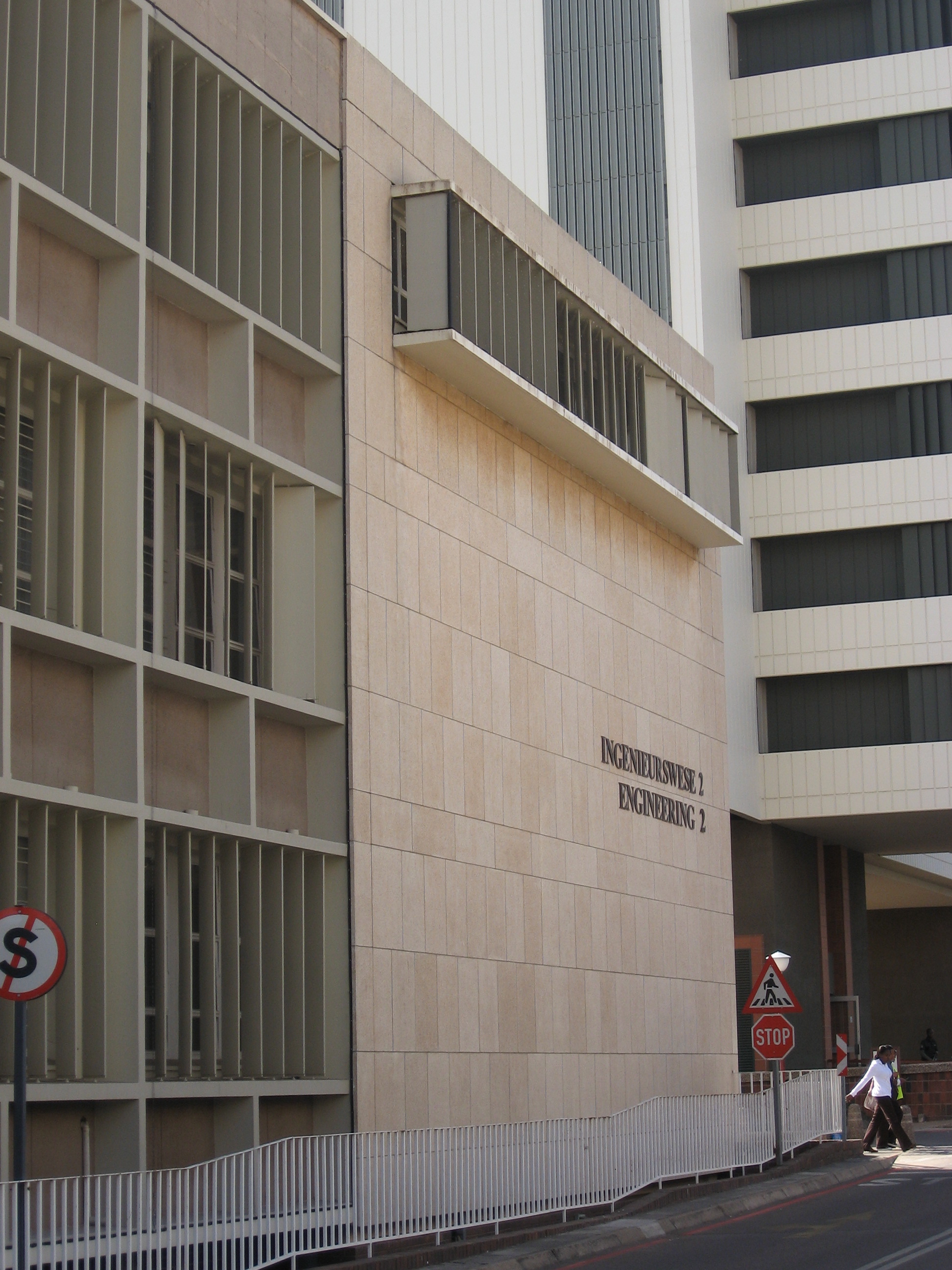 Initially known as the J G Strijdom Building, it is similar to the Mineral Sciences Building, as the architectural firm Meiring Naudé already had plans for building a mirror image of that building. Showing aspects of the Little Brazilian or Modern Brazilian style, also known as the Cobra style, it forms an integral part of the inner courtyard of the campus. It was built to provide additional accommodation for the Faculty of Engineering and by completion in 1960 it could accommodate around 1 200 students. The cornerstone was laid by Prime Minister J G Strijdom on 6 April 1957. Over the years numerous extensions were added. The building is now known as the Engineering II building, in accordance with the University policy of naming buildings according to their primary function.