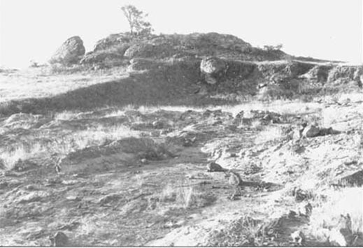 The summit of Mapungubwe Hill in 1972. Here Gardner's large scale excavation can be seen near the western end of the hill, viewed from the south, Excavation Mk 1 was done in 1973 in the western wall of Gardner's excavation, to the left