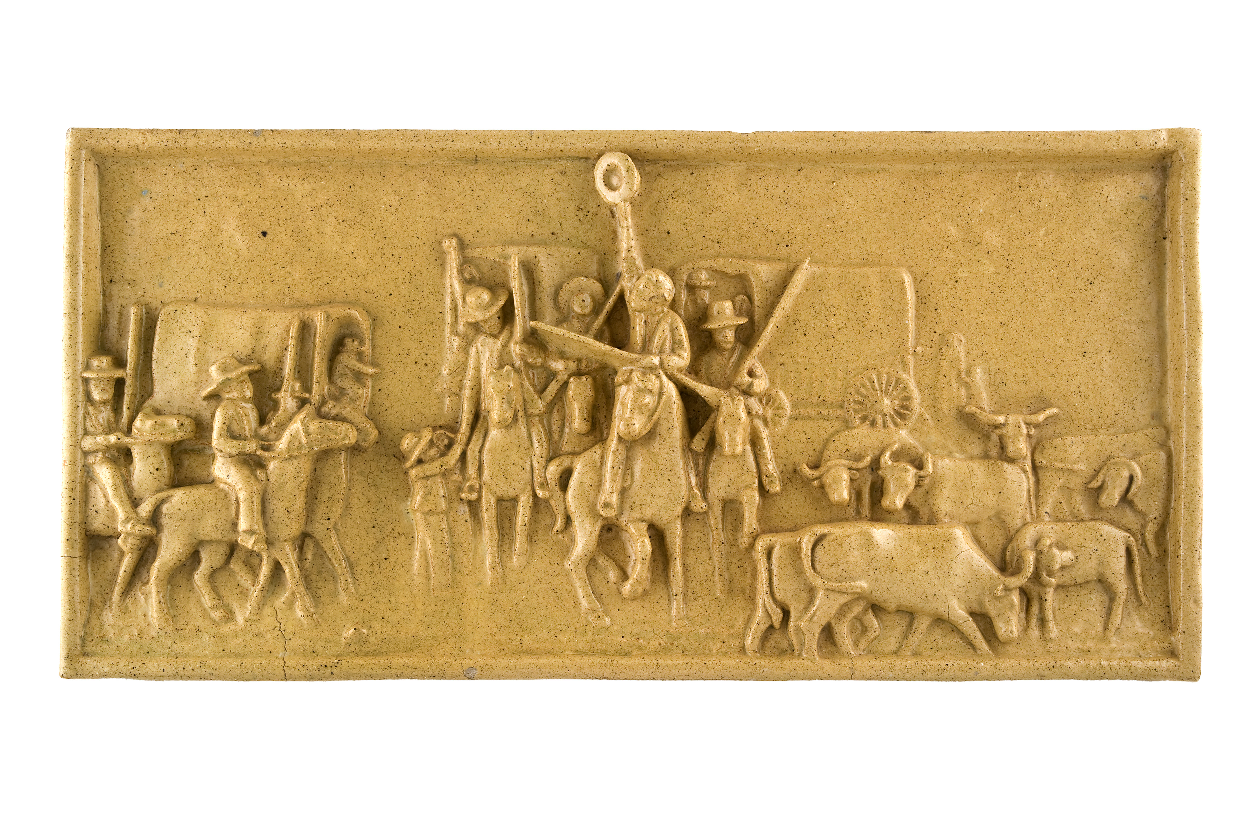 This lead-glazed earthenware tile shows a central group of four figures on horseback, the one in the middle raising his hat on high, wagons in the background and horsemen to the left and cattle and sheep to the right. In August 1938 the pioneer South African sculptor, Anton van Wouw (1862-1945), received a commission to make a panel to commemorate the centennial of the Great Trek, which would be erected at each school in Johannesburg.