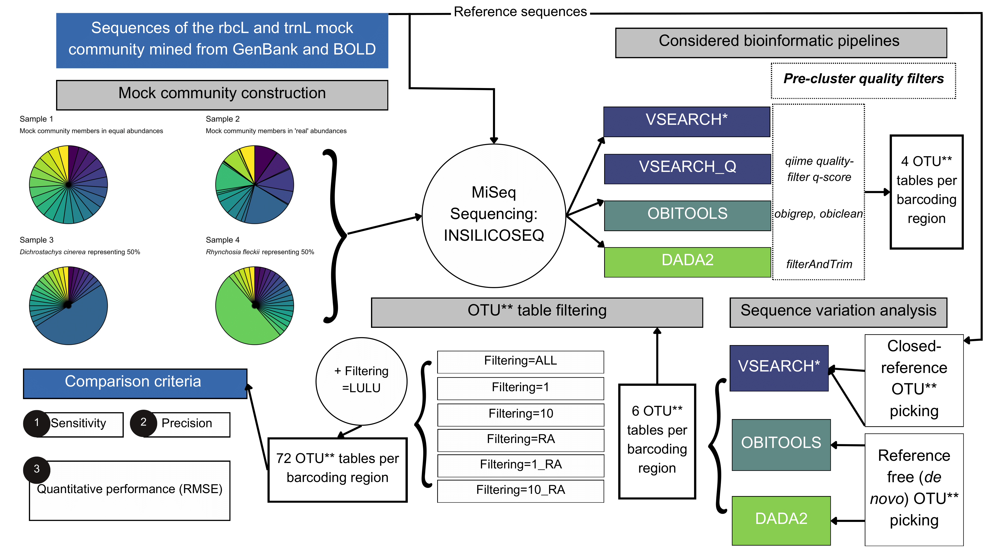 SUPPLEMENTARY MATERIAL 2 : Overview of the main steps followed in the materials and methods section for the mock community analysis conducted in Botha (2023). Explanation note: * An external quality filter was added to the VSEARCH approach since this workflow does not incorporate one in its various steps. ** “OTU” in this diagram may refer to operational taxonomic units as retrieved from the clustering of sequences based on 97% similarity in the VSEARCH approach, amplicon sequence variants retrieved by the inference of an error model in the DADA2 approach or grouping of strictly identical sequences as in the OBITOOLS approach.