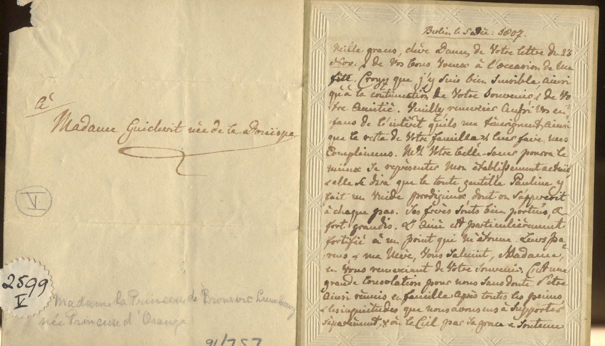 Letter written in Berlin, 5 December 1807, by Louise van Brunswijk-Wolfenbuttel (1770-1819) to Ms Guicherit. Louise is the daughter of Willem V and sister to King Willem I of the Netherlands.