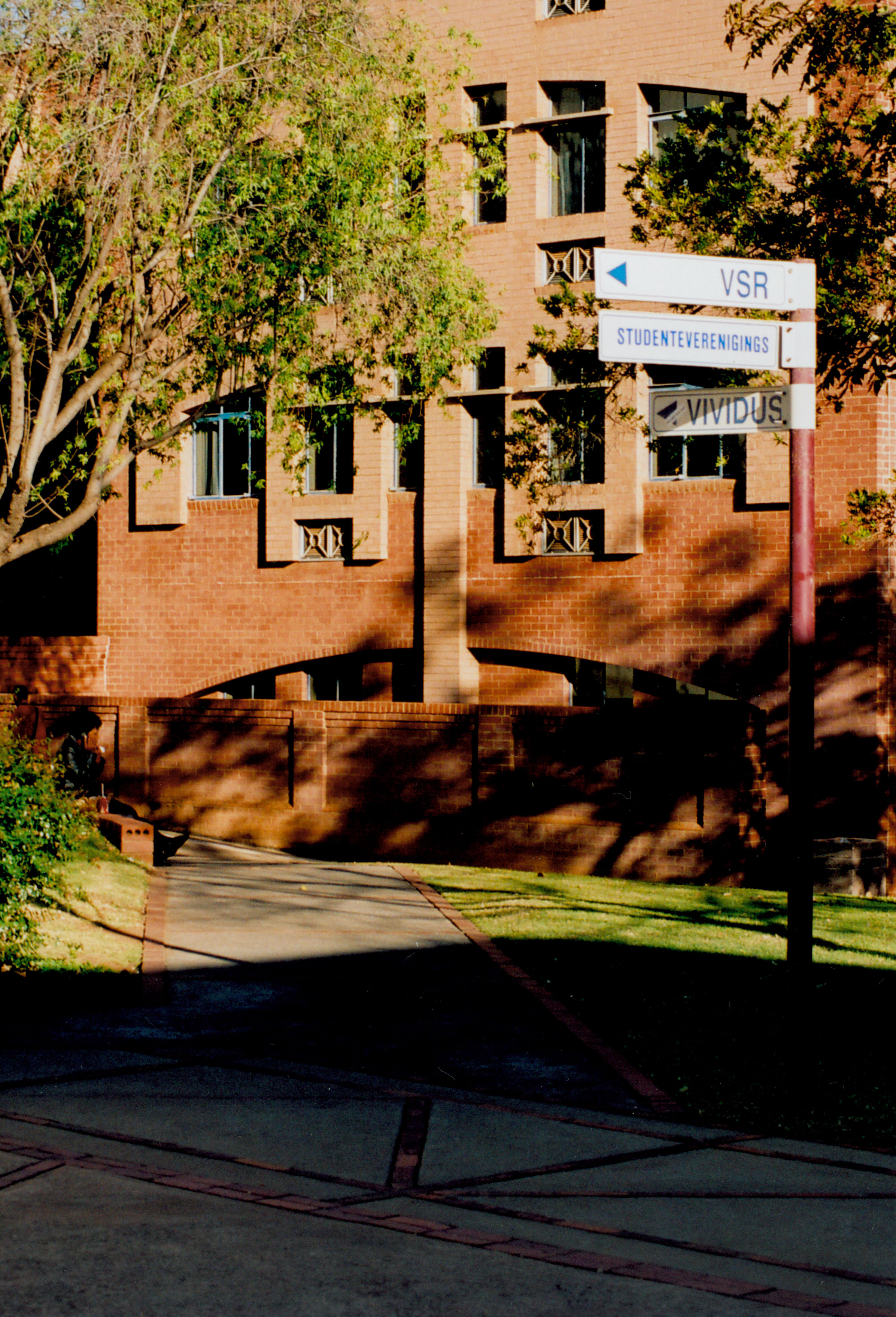 Side view of the Economic and Management Sciences Building displaying the university directions, Hatfield Campus, University of Pretoria.