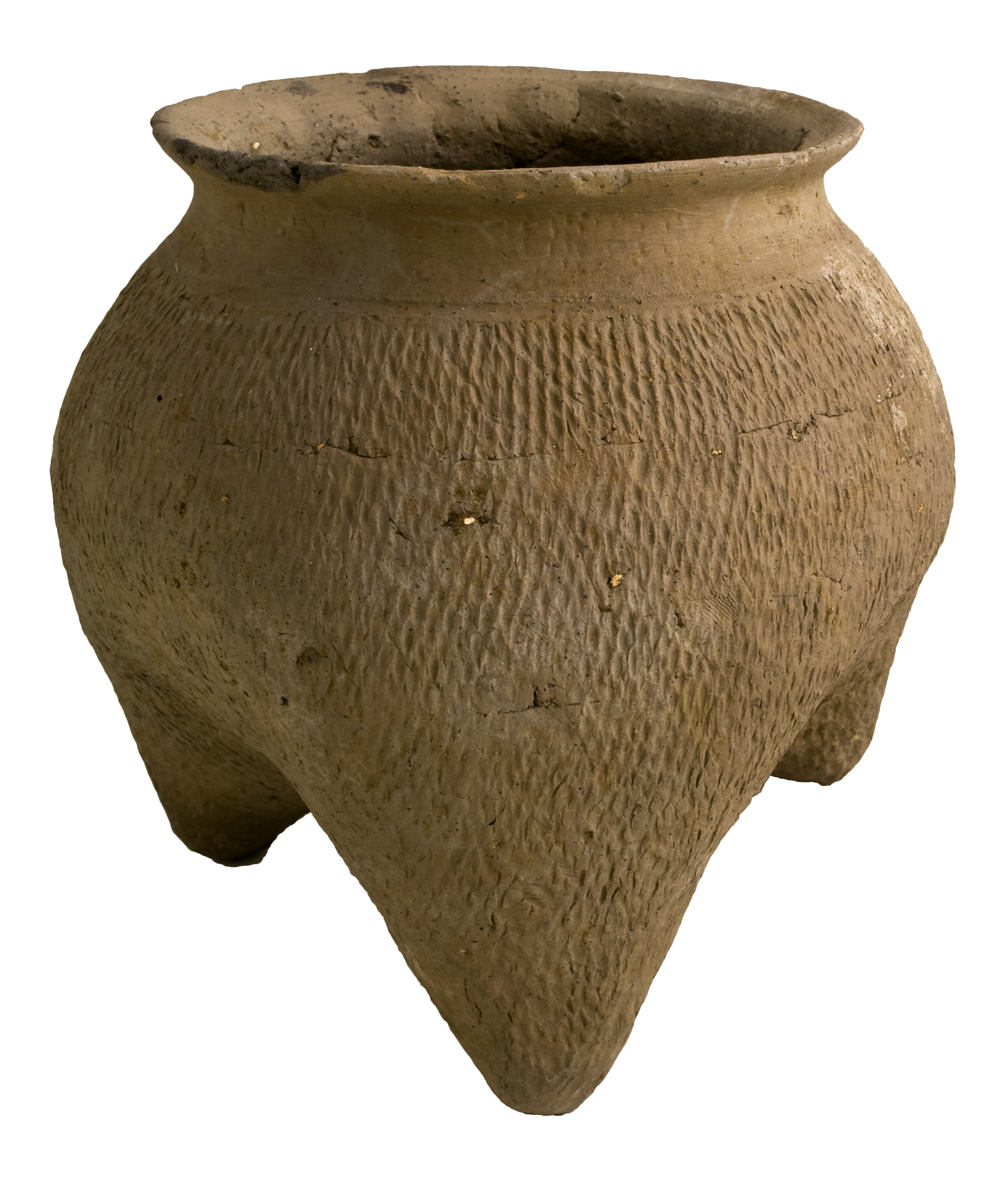 This light grey three-legged Li-shaped bowl, tapering to the three tripod legs and averted wide rim, is made from kaolin earth and its body is decorated with vertical string impressions. The shape shows a prototype of many later bronze vessels. It is possible that this form derived from the custom of leaning three pointed type vessels together over a fire.