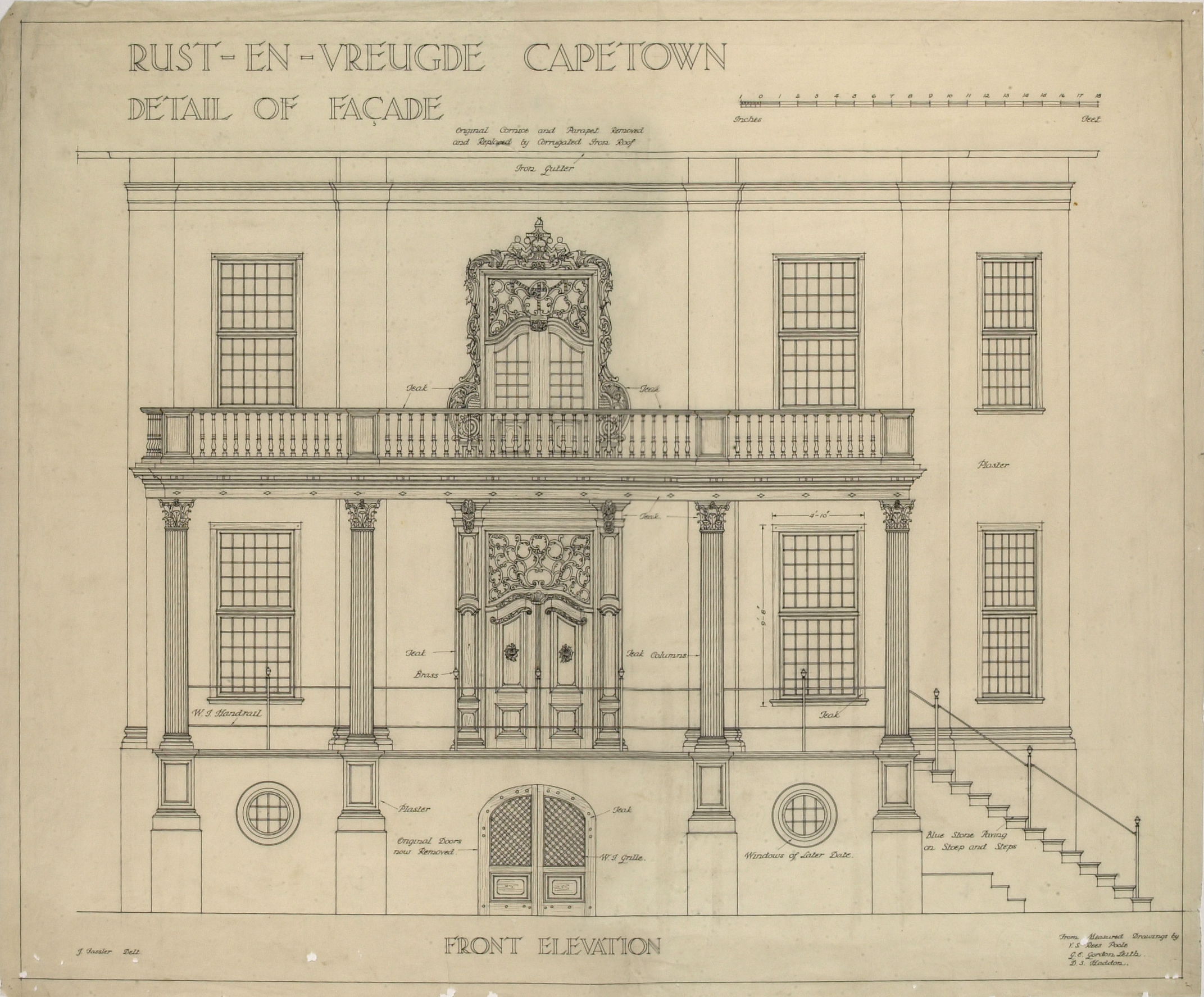 Front elevation of the Cape Dutch homestead of Rust-en-Vreugde in Cape Town, measured by V.S. Rees Poole, Gordon Leith and D. S. Haddon, and redrawn by John Fassler for prof. Geoffrey Pearse's book "Eighteenth Century Architecture in South Africa" – see page 41 for a description, and Plate 31 for the drawing. It displays a teak portico and balcony resting on Corinthian columns.