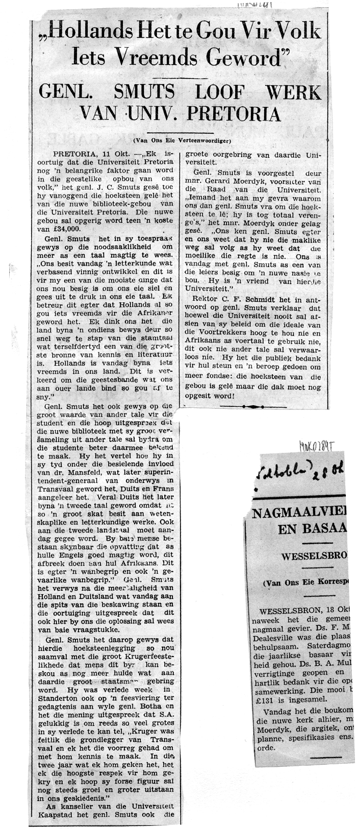 Genl. J. C. Smuts het by die hoeksteenlegging van die biblioteekgebou van die Universiteit van Pretoria verklaar dat die Universiteit 'n belangrike rol gaan speel in die geestelike opbouing van die Afrikanervolk.