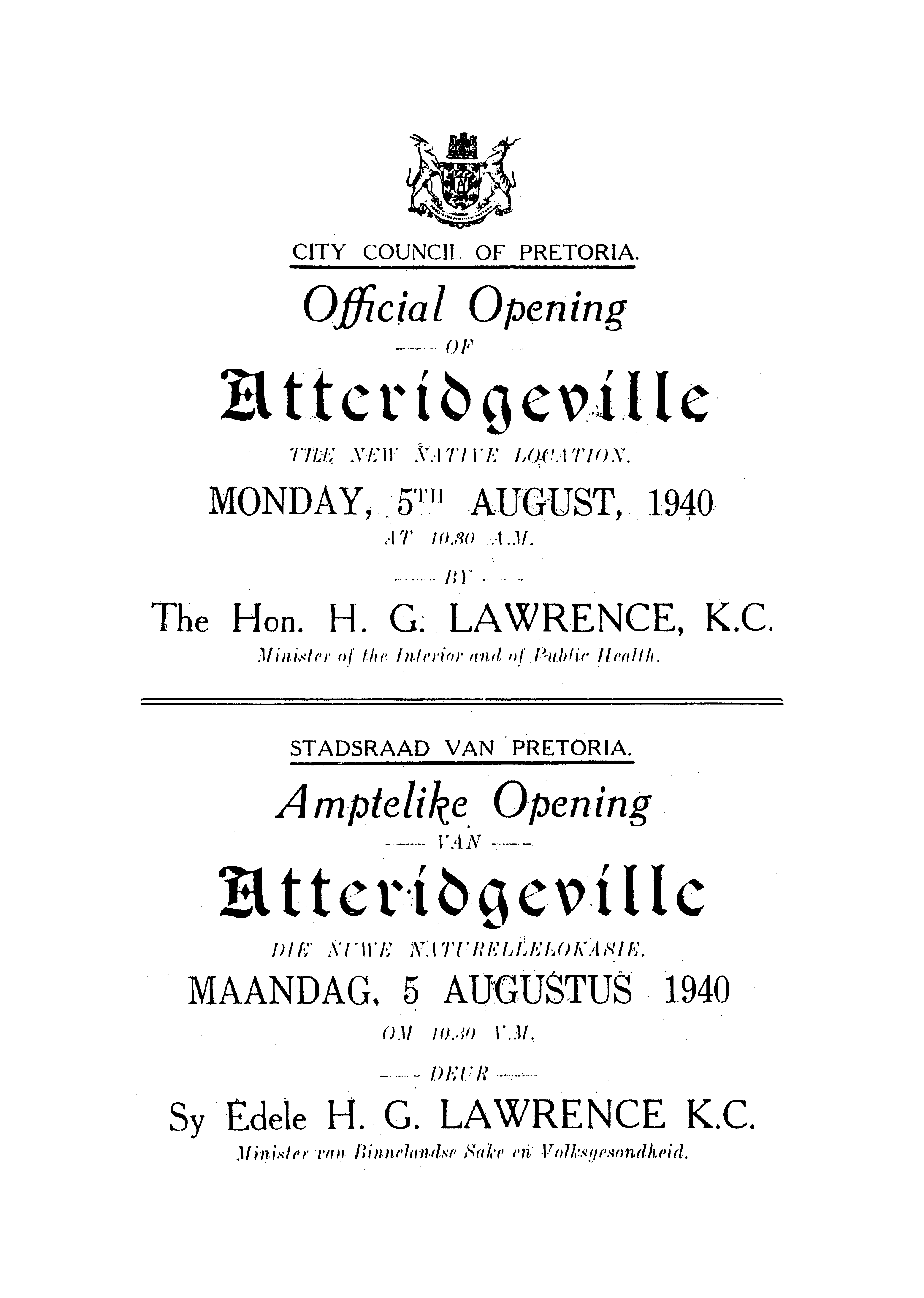 Official opening, Atteridgeville, City Council of Pretoria