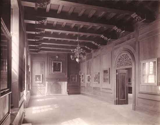 Photograph by Arthur Elliott of the interior of the Burgher Watch House in Cape Town, as restored by the Late J.M. Solomon. Entry to the wood panelled room with beamed ceiling is gained through double doors with an elaborately carved fanlight. The photograph appears as Plate 13 in prof. Geoffrey Pearse's book "Eighteenth Century Furniture in South Africa" - see page 40 for a description.