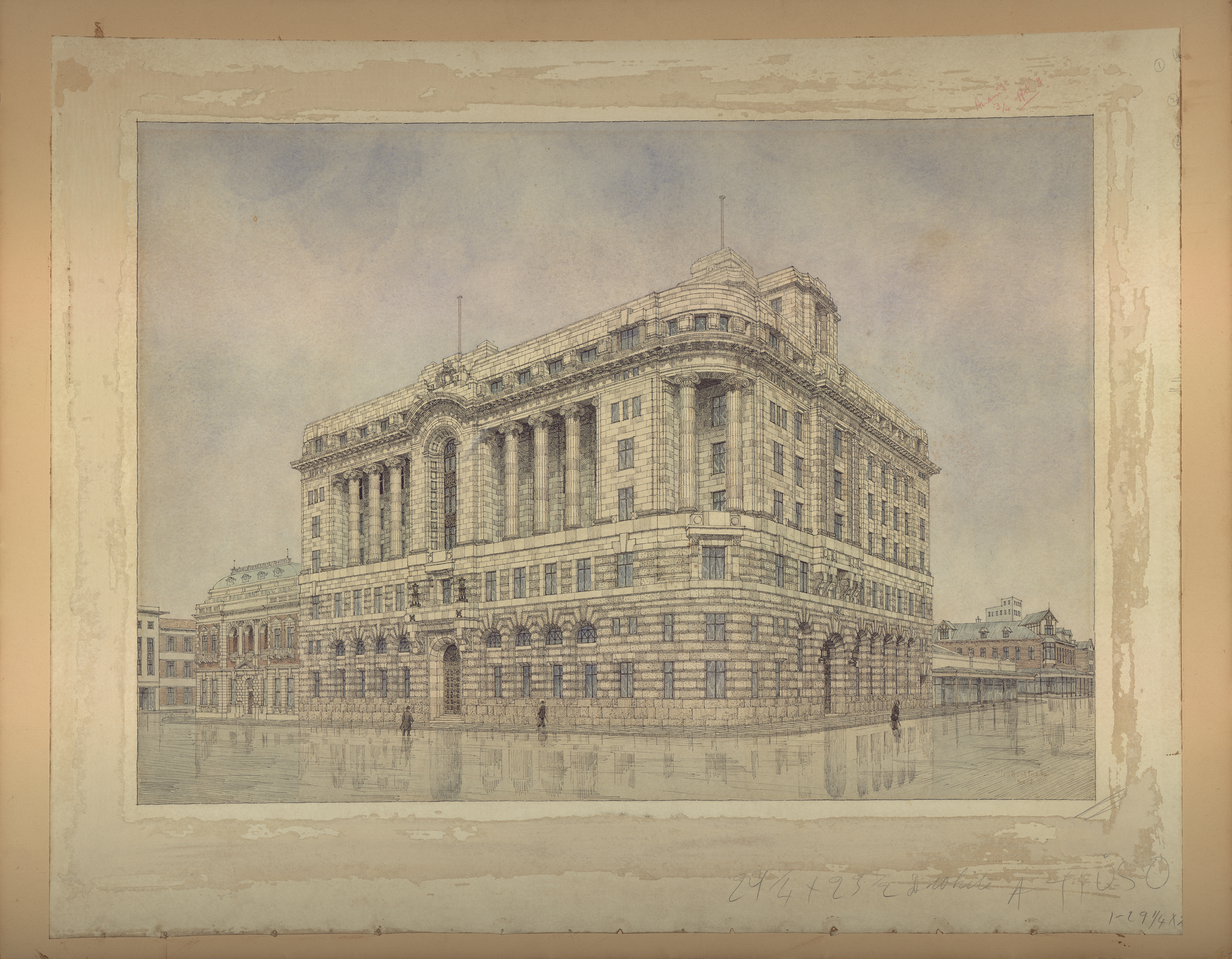 Landau Brothers Wholesale Merchants, watercolour in original frame, with ‘signature figure’. Signature hidden by frame.
