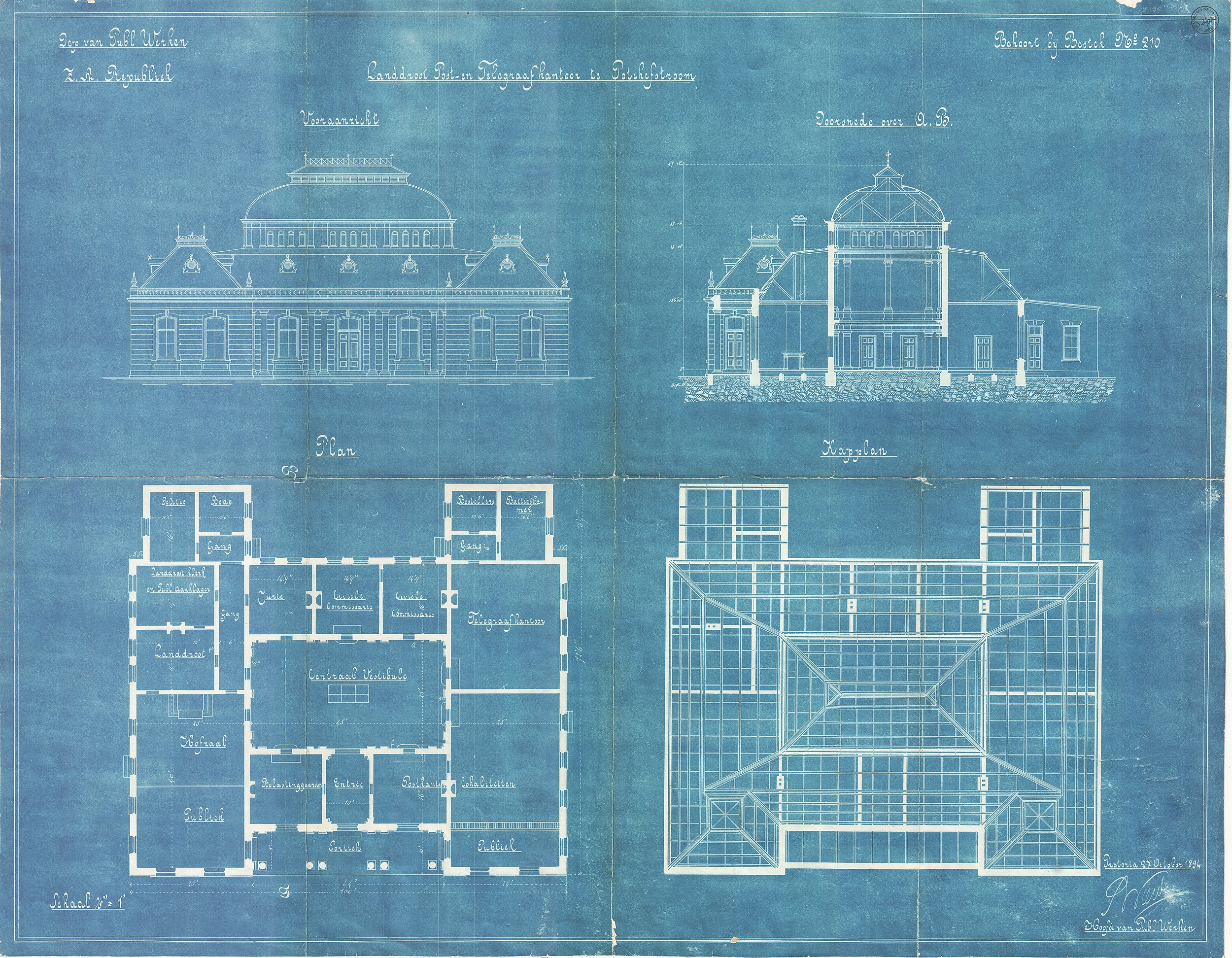 Digitised version of National Archive file S.2/122. Drawings of the Magistrate's and Post and Telegraph Office, Potchefstroom, depicting the "Vooraanzicht, Doorsnede. Plan, Kapplan" (Front Elevation, Section, Plan, Truss Plan). Signed by "S.W. Wierda, Hoofd, Publieke Werken"