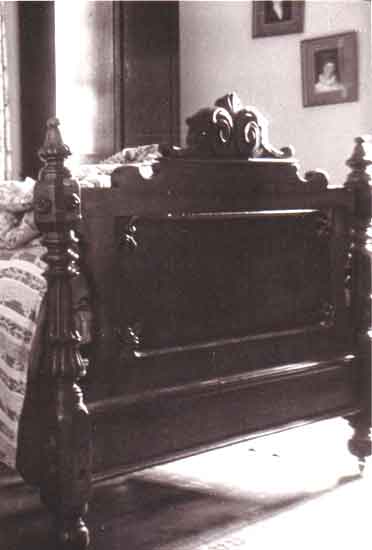Two photographs depicting a bed and its footboard, origin and date unknown. The headboard has tall, slender turned posts, and the footboard is richly carved. All the posts are topped by finials.