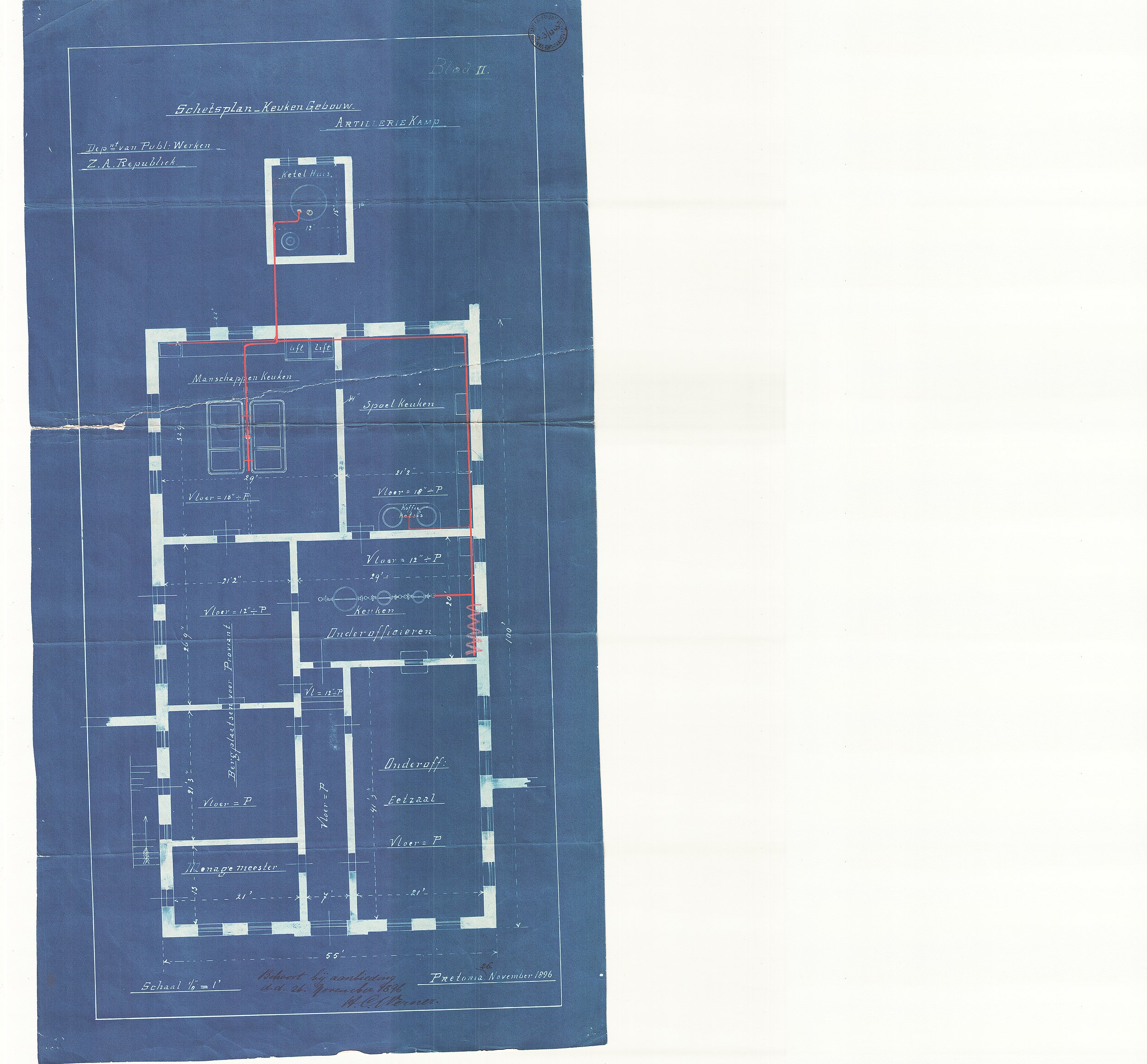 Digitised version of National Archive file S.3/1245-. Sketch plan "Blad ll" (Slab II) of the kitchen, Artillery Camp, Pretoria