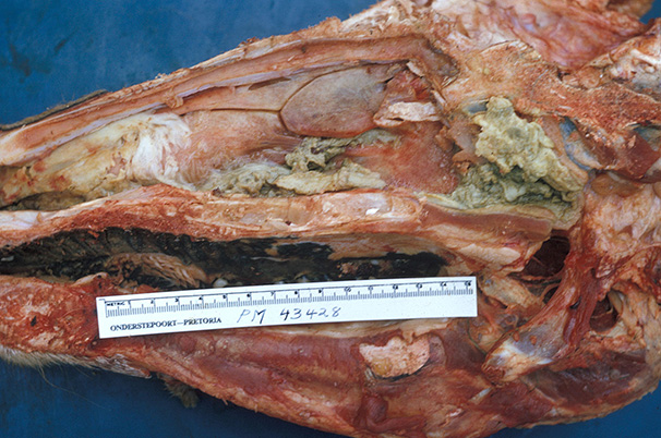 Malignant catarrhal fever (MCF) : cross-section of the nasal cavity showing severe mucopurulent exudation between the turbinates