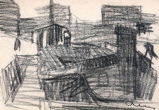 Charcoal sketch of large barge at the dock with warehouses in the background.