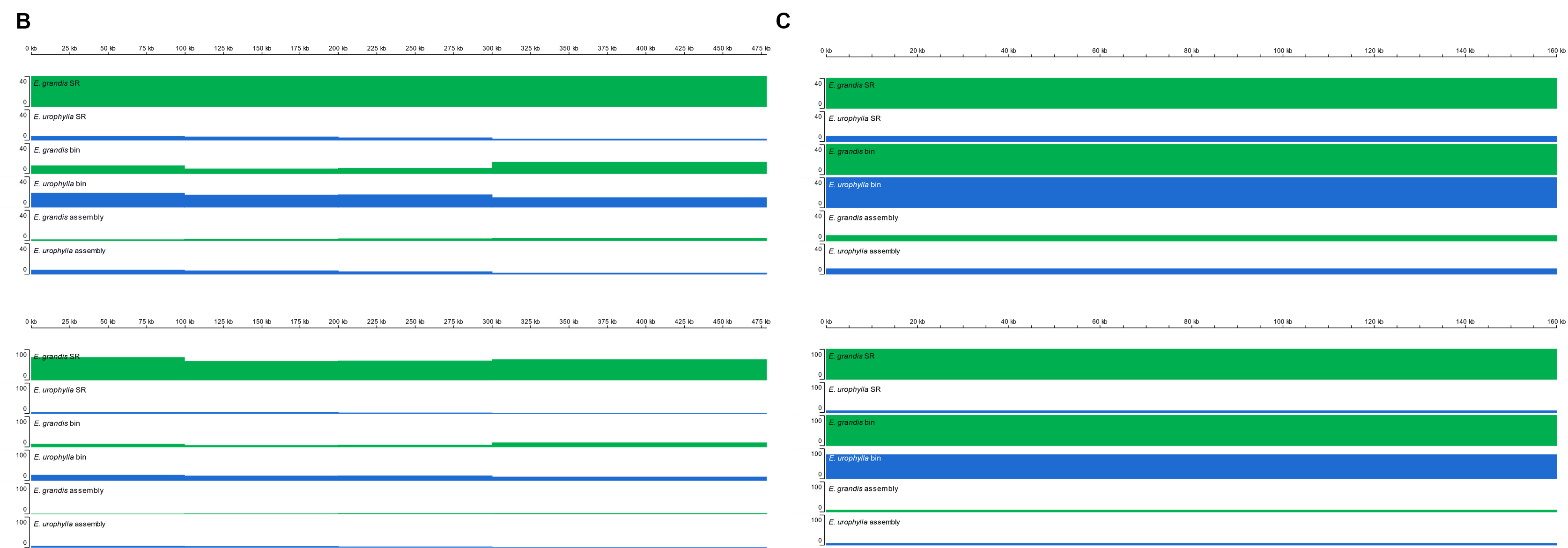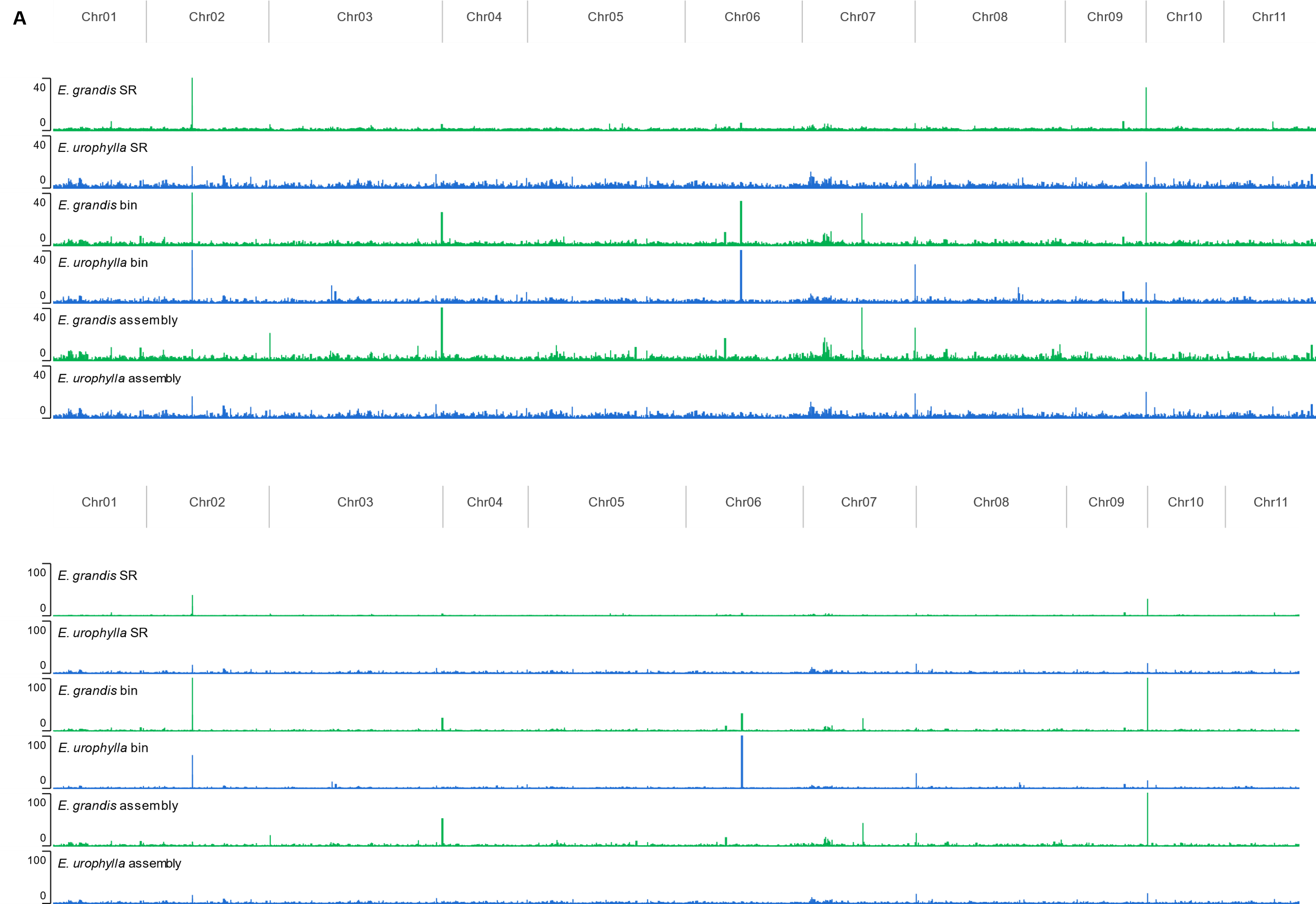 ADDITIONAL FILES : SUPPLEMENTARY FIGURE S1: Genome size estimates for the (A) E. urophylla, (B) E. grandis and (C) the E. urophylla x E. grandis F1 hybrid genomes. SUPPLEMENTARY FIGURE S2: Benchmarking Universal Single-Copy Orthologs (BUSCO) completeness scores for both haplogenome assemblies as well as the currently available E. grandis v2.0 reference genome. SUPPLEMENTARY FIGURE S3: Alignment of placed haplogenome scaffolds to the E. grandis v2.0 reference genome. SUPPLEMENTARY FIGURE S4: Alignment between the E. grandis and E. urophylla scaffolded haplogenome assemblies. SUPPLEMENTARY FIGURE S5: Pseudochromosomes of E. urophylla haplogenome, reconstructed from two genetic linkage input maps – uro.allmap and gra.allmap, with unequal weights (2 and 1 respectively). SUPPLEMENTARY FIGURE S6: Pseudochromosomes of E. grandis haplogenome, reconstructed from two genetic linkage input maps – gra.allmap and uro.allmap, with unequal weights (2 and 1 respectively). SUPPLEMENTARY FIGURE S7: Scaffolded chromosome sizes of the E. grandis v2.0 and the scaffolded E. grandis and E. urophylla haplogenome assemblies. SUPPLEMENTARY FIGURE S8: Alignment of unplaced E. grandis and E. urophylla haplogenome scaffolds to the E. grandis v2.0 reference genome. SUPPLEMENTARY FIGURE S9: Syntenic and rearranged regions between the E. grandis v2.0, E. grandis and E. urophylla haplogenomes for all eleven chromosomes. SUPPLEMENTARY FIGURE S10: Enriched gene ontology (GO) terms for inverted and translocated gene alignment blocks of the E. grandis haplogenome. SUPPLEMENTARY FIGURE S11: Enriched gene ontology (GO) terms for inverted and translocated gene alignment blocks of the E. urophylla haplogenome. SUPPLEMENTARY FIGURE S12: Enriched gene ontology (GO) terms genes that did not have pairwise alignment between the E. grandis and E. urophylla haplogenomes. SUPPLEMENTARY FIGURE S13: Hap-mer blob plot of the E. grandis and E. urophylla haplogenome assemblies. SUPPLEMENTARY FIGURE S14: Evaluation of haplotype phase blocks. All hap-mer information was generated with Merqury v1.1 [72]. SUPPLEMENTARY FIGURE S15: Genome coverage of the E. grandis v2.0 nuclear reference and plastid genomes. SUPPLEMENTARY FIGURE S16: Summary of the total size and type of elements found in high genome coverage bins. Organellar introgression was identified through BLAST analysis to the E. grandis plastid genomes [77], while repeat elements were identified with RepeatMasker. SUPPLEMENTARY NOTE 1: Hapmer based phasing completeness assessment. SUPPLEMENTARY NOTE 2: Read and assembly alignment and validation of high peak content. SUPPLEMENTARY TABLE S1: Illumina sequencing results. SUPPLEMENTARY TABLE S2: Nanopore sequencing results for the F1 hybrid individual. SUPPLEMENTARY TABLE S3: Summary statistics for long-read binning using the parental short reads. SUPPLEMENTARY TABLE S4: Summary statistics of placed and unplaced contigs after scaffolding with ALLMAPS for the E. urophylla and E. grandis haplogenomes respectively. SUPPLEMENTARY TABLE S5. Repeat element content of assembled haplogenomes. SUPPLEMENTARY TABLE S6: Haplogenome annotation statistics. SUPPLEMENTARY TABLE S7: Number and total length of syntenic and rearranged regions in the E. grandis and E. urophylla haplogenomes. SUPPLEMENTARY TABLE S8: Number and total length of local sequence variation in syntenic and rearranged region in the E. grandis and E. urophylla haplogenomes. SUPPLEMENTARY TABLE S9: Inversions larger than 50 kb between the E. grandis and E. urophylla haplogenomes. SUPPLEMENTARY TABLE S10: Translocations between the E. grandis and E. urophylla haplogenomes that are larger than 50 kb. SUPPLEMENTARY TABLE S11: KEGG pathway enrichment analyses for genes within inverted and translocated gene alignment blocks between the E. grandis and E. urophylla haplogenome assemblies. SUPPLEMENTARY TABLE S12: KEGG pathway enrichment analyses for genes that do not have a pairwise alignment between the E. grandis (reference) and E. urophylla (test) haplogenome assemblies. SUPPLEMENTARY TABLE S13: Altered position and length of genes with an in-frame stop codon. SUPPLEMENTARY TABLE S14: Phase block statistics of the E. grandis and E. urophylla haplo-genome assemblies. SUPPLEMENTARY TABLE S15: E. grandis and E. urophylla high coverage bin content.