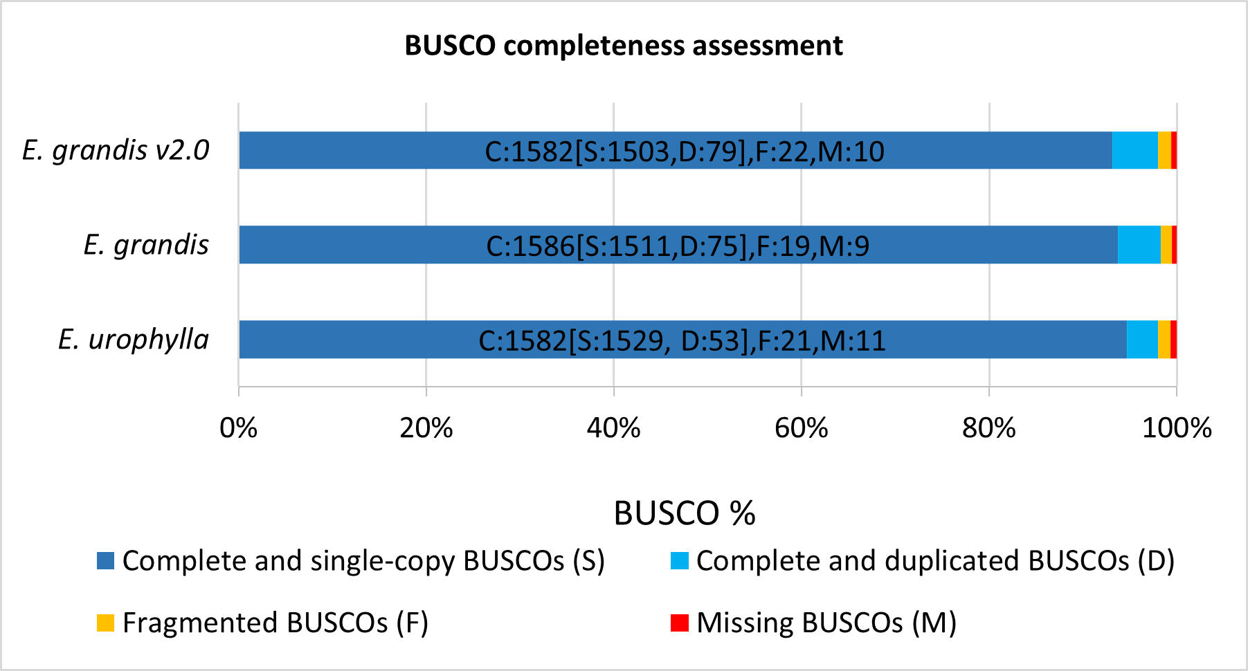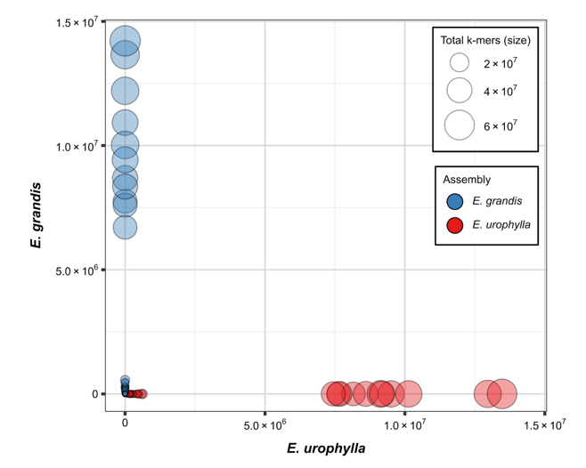 Using Nanopore sequencing and a trio-binning approach, we assembled the separate haplogenomes (566.7 Mb and 544.5 Mb) to 98.0% BUSCO completion. High-density SNP genetic linkage maps of both parents allowed scaffolding of 88.0% of the haplogenome contigs into 11 pseudo-chromosomes (scaffold N50 of 43.8 Mb and 42.5 Mb for the E. grandis and E. urophylla haplogenomes, respectively). We identify 48,729 SVs between the two haplogenomes providing the first detailed insight into genome structural rearrangement in these species. The two haplogenomes have similar gene content, 35,572 and 33,915 functionally annotated genes, of which 34.7% are contained in genome rearrangements.
