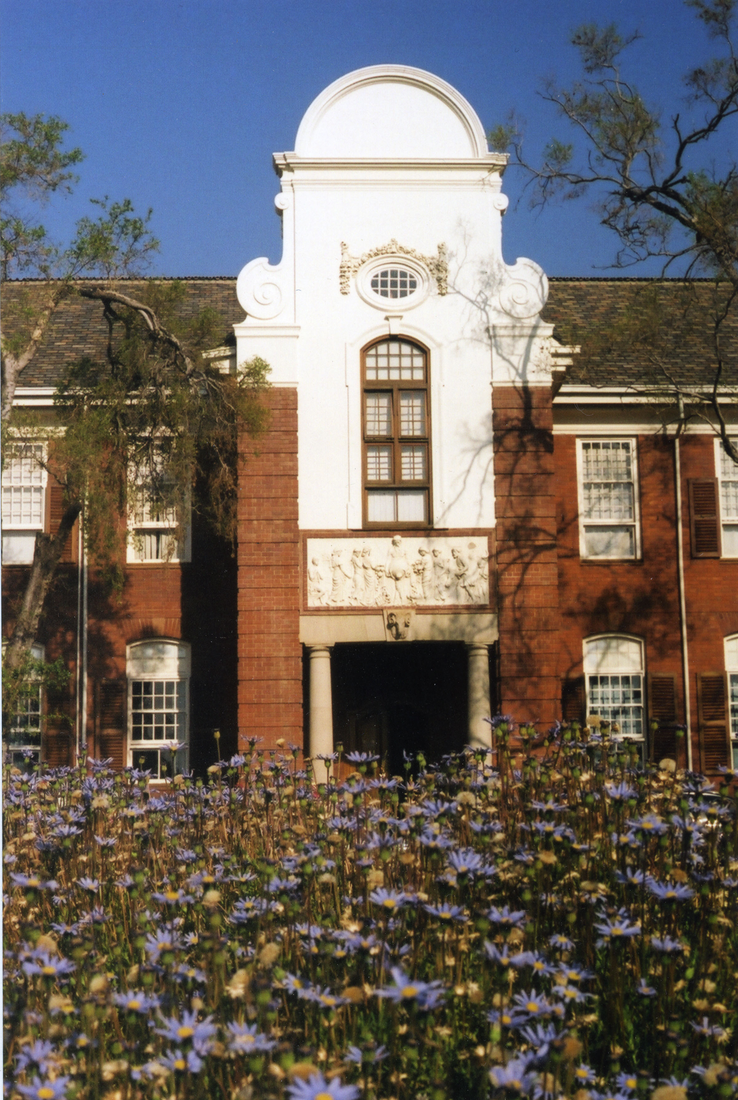 Front view of the Old Agricultural Building entrance behind some flowers, Hatfield Campus, University of Pretoria.