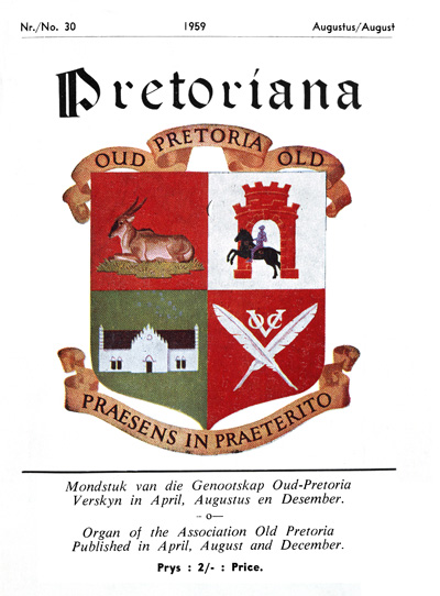 Heloise Greenlees : in memoriam / W. Punt -- Bulldozing history -- Die Suid-Afrikaanse museumwese / H. Muller -- Pretoria's oldest building to be demolished and dumped on a waste lot -- Verslag van 'n onderhoud / G.W. Eybers -- Byskrif by 'n foto van Dr. G.W. Eybers -- Die oudste huis in die omgewing van Pretoria / F.C. Calitz -- Hartebeespoort nr. 308 -- Enkele grepe uit die geskiedenis van Silverton / B. Auret, A. Bester -- A building almost as old as Johannesburg -- 'n Petisie in sake "De Botanischen Tuin" (Burgerspark) -- KNoffel en kanfer / J.P. Kleynhans