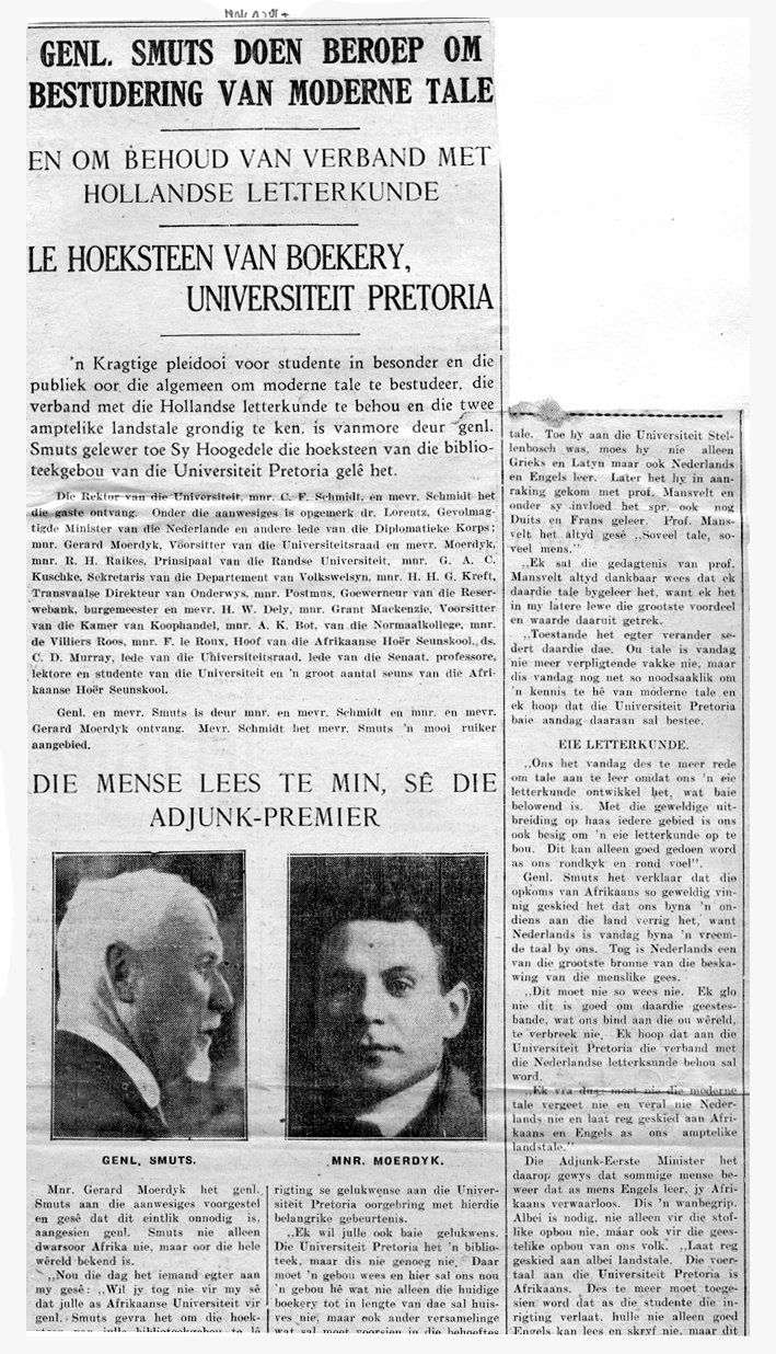 At the cornerstone (foundation stone) laying of the University of Pretoria's library, Gen. Smuts called upon the students and the public to study modern languages, thus retaining the connection with Dutch literature at the same time giving equal footing to English and Afrikaans.