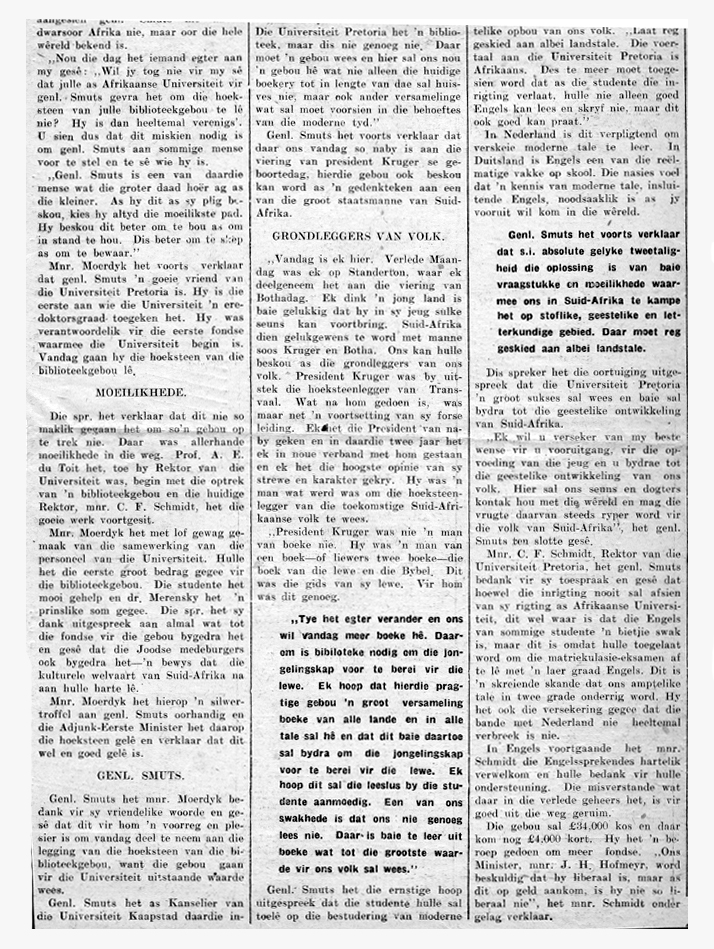 | dc.description.abstract | At the cornerstone (foundation stone) laying of the University of Pretoria's library, Gen. Smuts called upon the students and the public to study modern languages, thus retaining the connection with Dutch literature at the same time giving equal footing to English and Afrikaans. | |