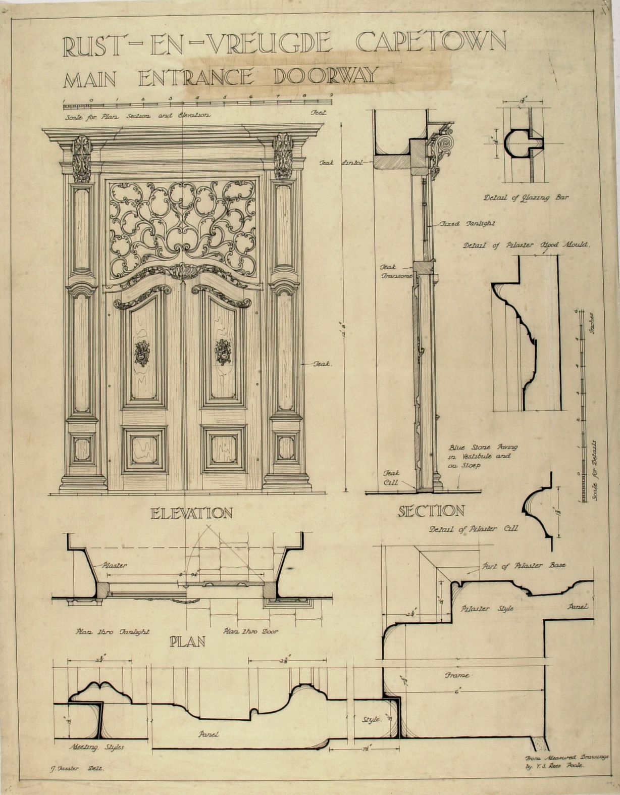 | dc.description.abstract | Plan, elevation, section and details of the main entrance doorway of Rust-en-Vreugde in Cape Town. Measured by V.S. Rees Poole and drawn by John Fassler for prof. Geoffrey Pearse's book "Eighteenth Century Architecture in South Africa" – see page 41 for a description and Plate 34 for the drawing. The doors, topped by an elaborate fanlight, are framed by panelled teak pilasters with an entablature above. | en_US |