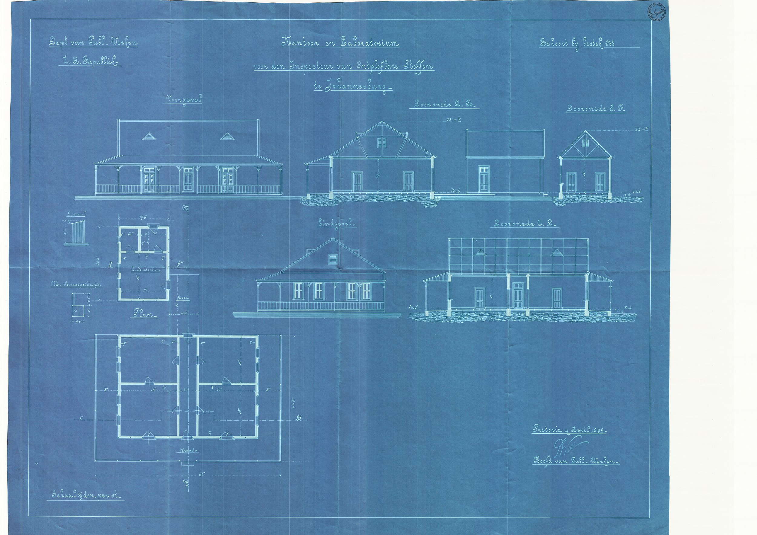 | dc.description | Digitised version of National Archive file S.3/1692. Drawings of the office and laboratory for the explosives inspector, including the "Voorgevel, Eindgevel, Doorsnede" (Front Gable, End Gable, Section), signed by "S.W. Wierda, Hoofd van Publ. Werken" | en |