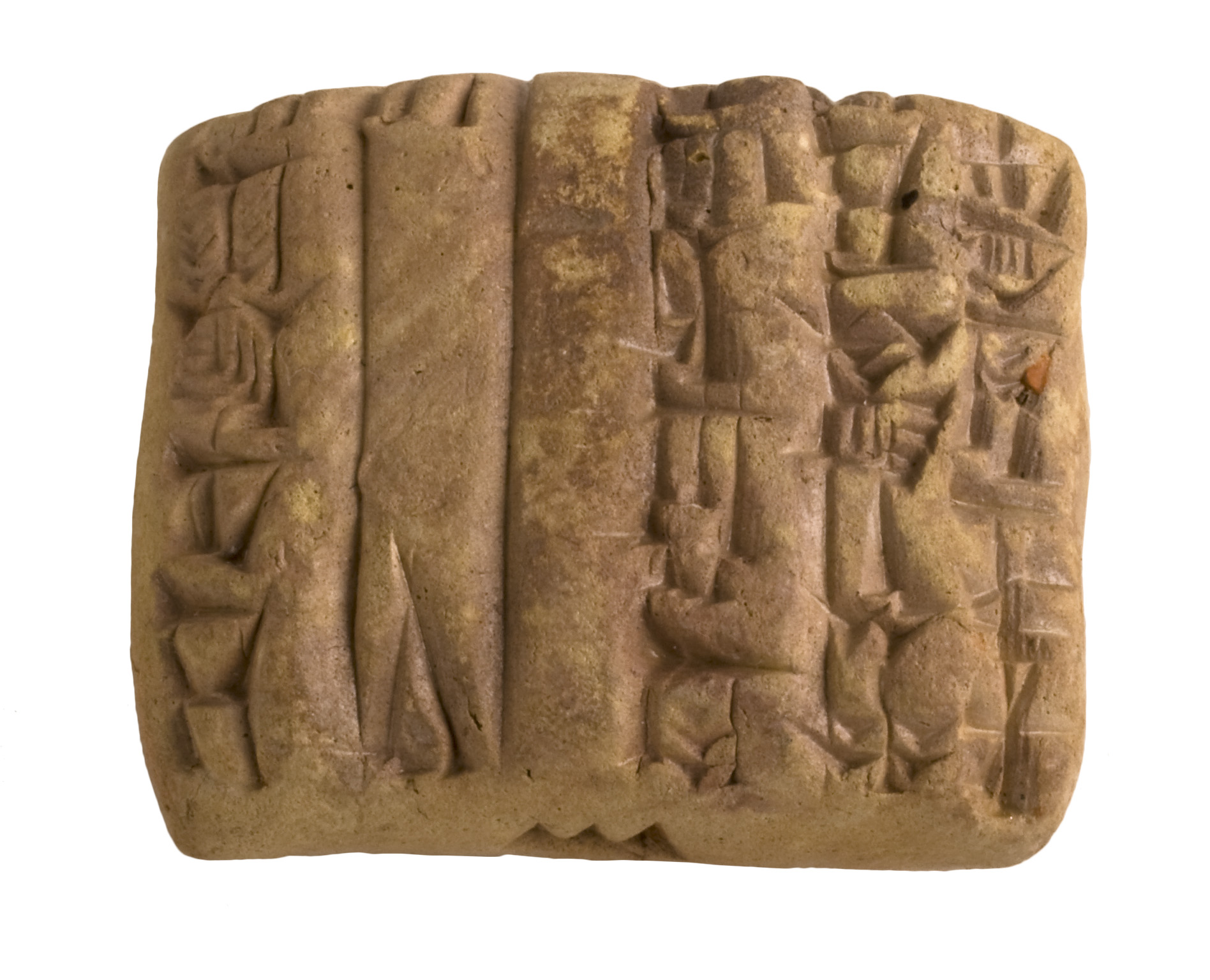 This small clay tablet with Babylonian cuneiform script dates to about 2200 BC. It is some type of invoice for agricultural products delivered to a ziggurat temple.