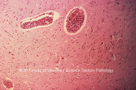 Turning sickness or cerebral theileriosis is an uncommon aberrant form of infection by Theileria parva or Theileria taurotragi in which lymphoblasts parasitized by schizonts accumulate in cerebral vessels leading to thrombosis and infarction. In the more acute form areas of intense congestion and haemorrhage are present in the meninges and brain which are associated with ares of softening (Infarction) and discoloration of brain tissue. Thrombosed meningeal vessels are often very promiment.