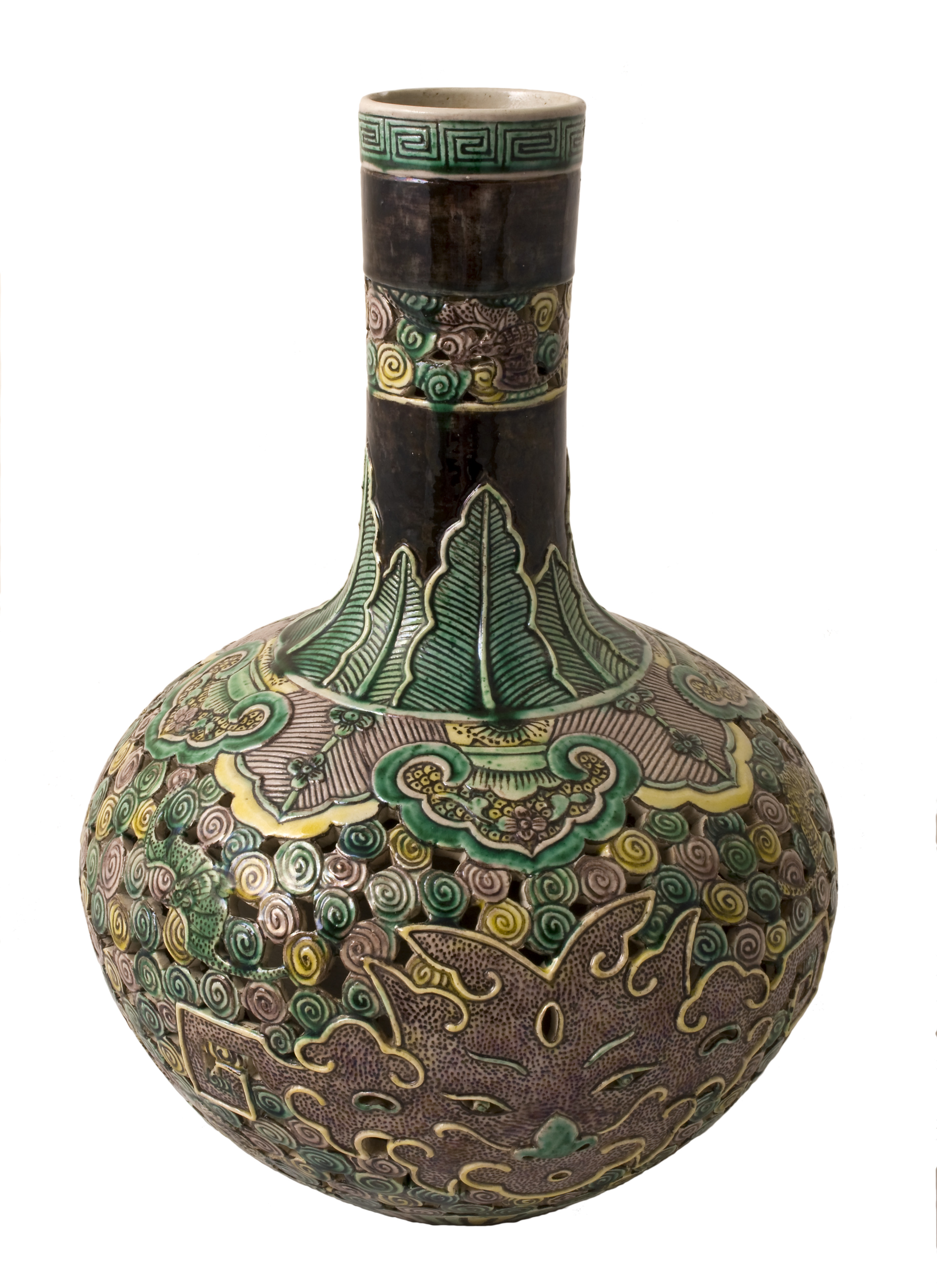 This polychrome porcelain Ling-lung bottle vase is decorated with t’ao-t’ie masks and bats on a fine openwork background of stylised clouds beneath a leaf pattern around the neck and ruyi pattern on the shoulder, all in aubergine, green, black and yellow. It has a fret pattern around the mouth and a pointed border around the base. The base is sunken, glazed and marked with six engraved Kangxi character marks. This type of vessel was considered to be Devil’s work or Ling-lung because the sides were perforated and pierced, but the vessel did not leak the fluids that were put into it. This vase is an example of the San-ts’ai glazing technique also known as fa-hua. The porcelain is fired first without glaze to a porcelain temperature and it is then decorated with enamel colours and fired again at a much lower temperature, the colours being separated from each other either by incised lines or by small, carefully applied threads of slip, as in the case of this vase.