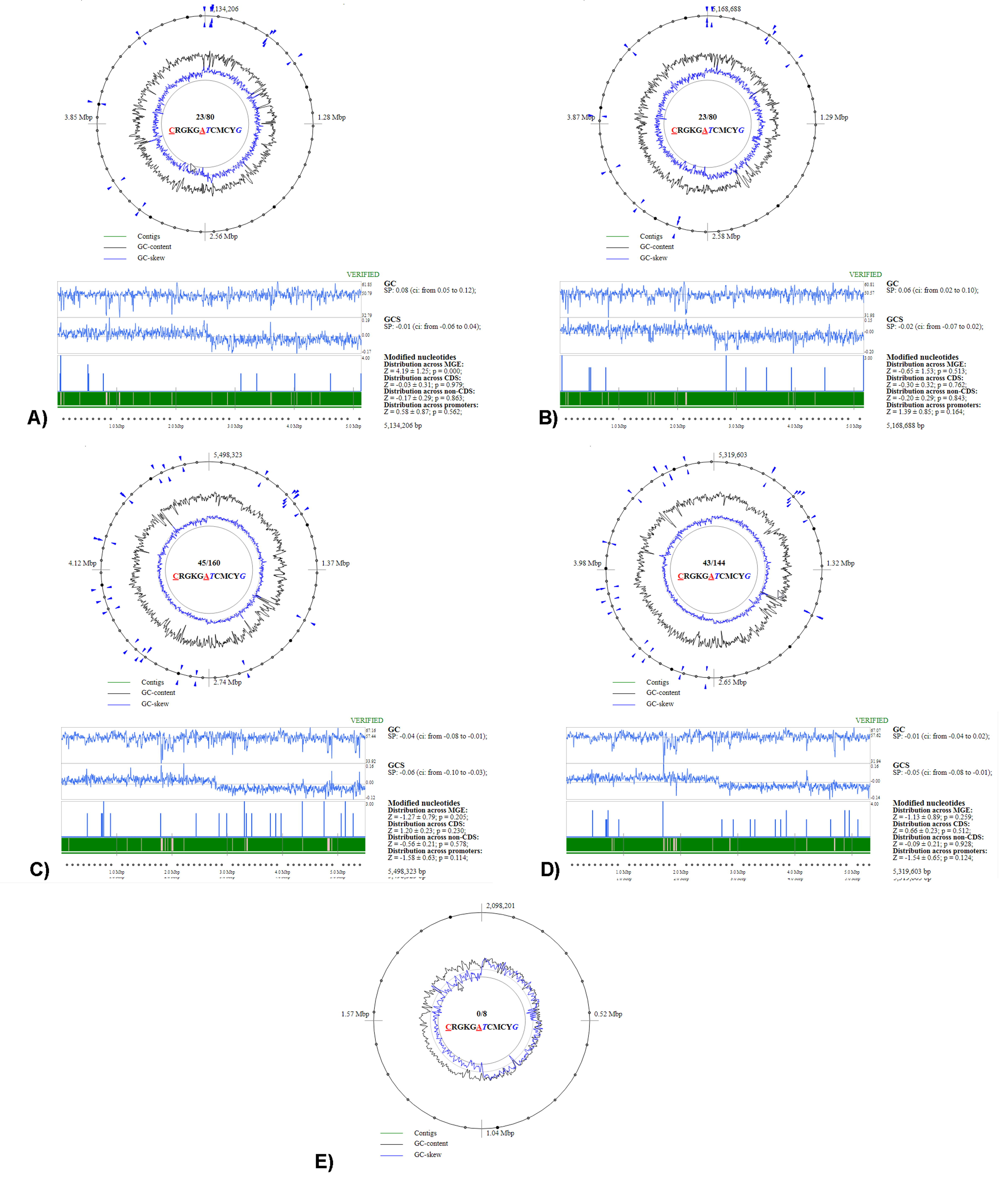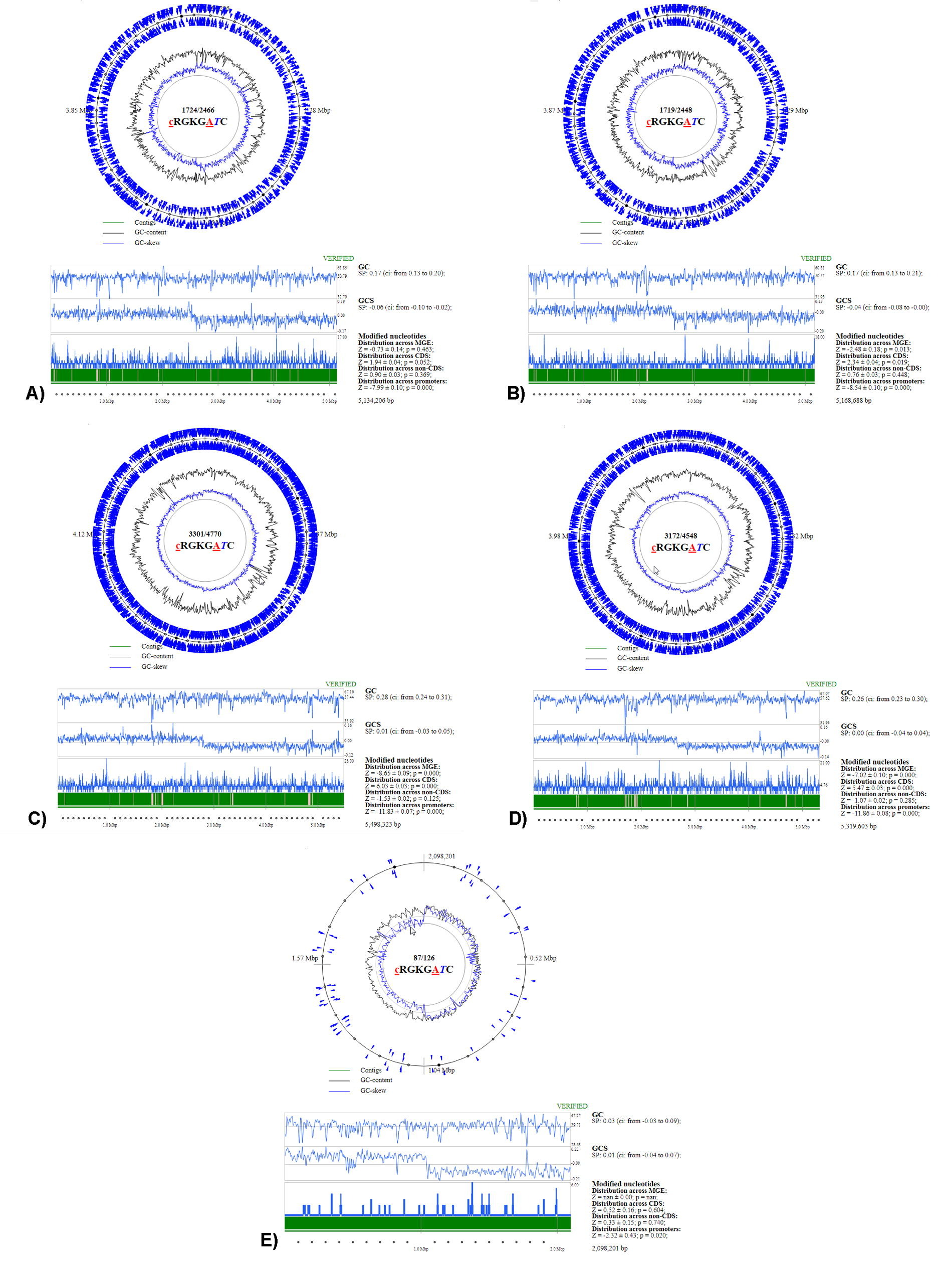 FIGURE S1. Supplementary Figure S1. Circular maps showing the distribution of methylated adenine and cytosine residues associated with cRGKGatC canonical motifs in the following genomes: (A) Escherichia coli 3/145 [CP082827]; (B) E. coli 19/278 [CP082830]; (C) Klebsiella pneumoniae 13/97 [CP082805]; (D) K. pneumoniae 20/245 [CP082796]; and (E) Streptococcus pneumoniae PHRX1 [CP082820].