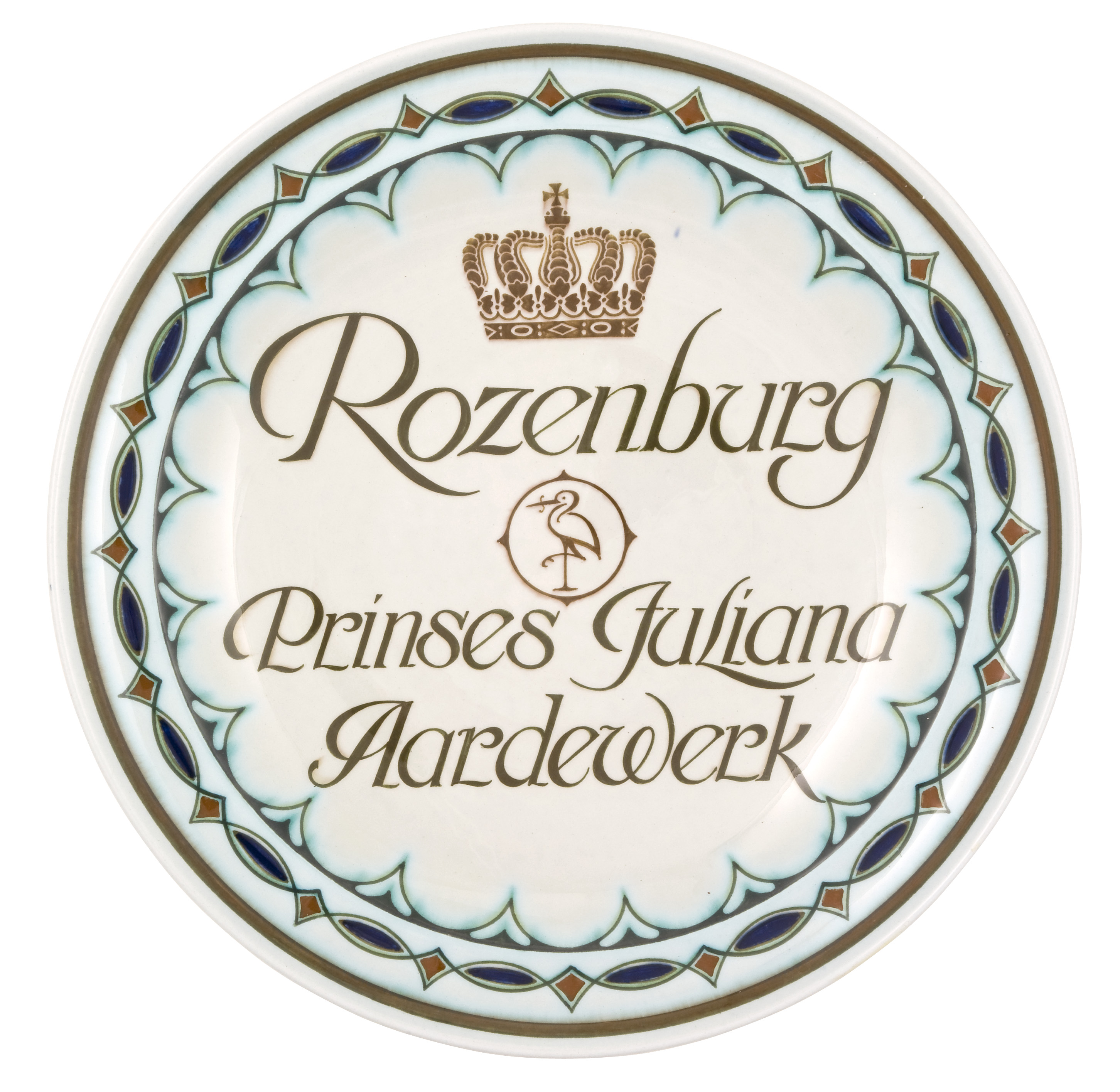 This round white plate with a thick blue-green glaze is decorated with circle and diamond-motifs on the cavetto. In the centre is a crown and stork with the inscription “Rozenburg, Prinses Juliana Aardewerk”. The plate has a sunken glazed base marked with a crowned stork and the inscription “Rosenburg Den Haag”. In 1910 a struggling N.V. Haagsche Plateelfabriek Rozenburg in the Hague started an exclusive ceramic series called Prinses Juliana Aardewerk to try to boost sales since commemorative ceramics were becoming increasingly popular. This plate was made as an advertising plate for the shop in The Hague that was selling Juliana-ware.
