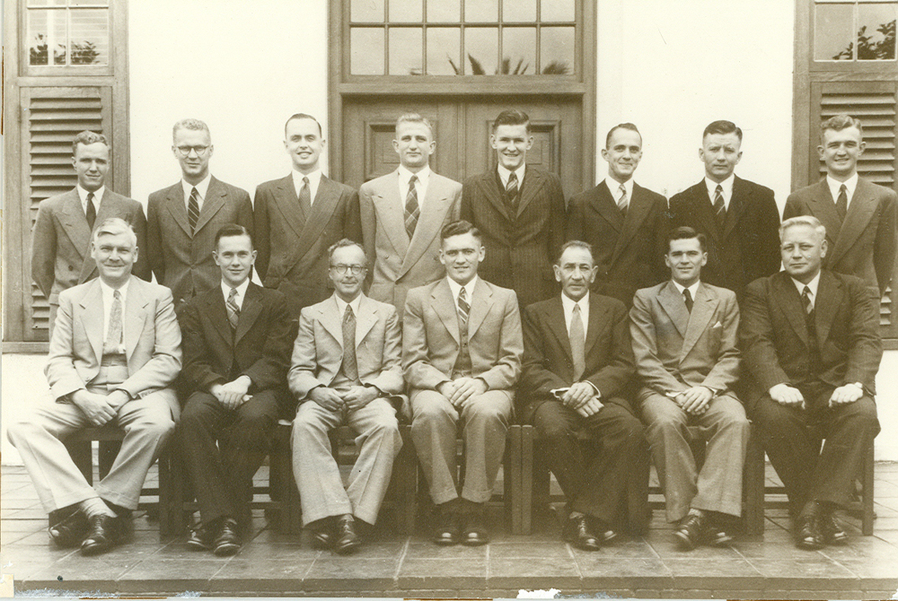 The photograph of the veterinary graduandi of 1951, in front of the Onderstepoort Library, is of the customary composite type. The names of the graduates and staff on the photo are Front (from left to right): Prof JDWA Coles, JMM Brown, Prof EM Robinson, PL Louw, Prof PJJ Fourie, DCL Wacher, Prof WO Neitz ; Second row: WB Hobbs, PJ Posthumus, CD Meredith, WAJ du Plessis, DK Shone, JFW Grosskopf, HJW Botes, RB Cumming. More information on some of the veterinarians can be read in: Past veterinarians in South Africa / Posthumus, P.J. URL: http://hdl.handle.net/2263/21238