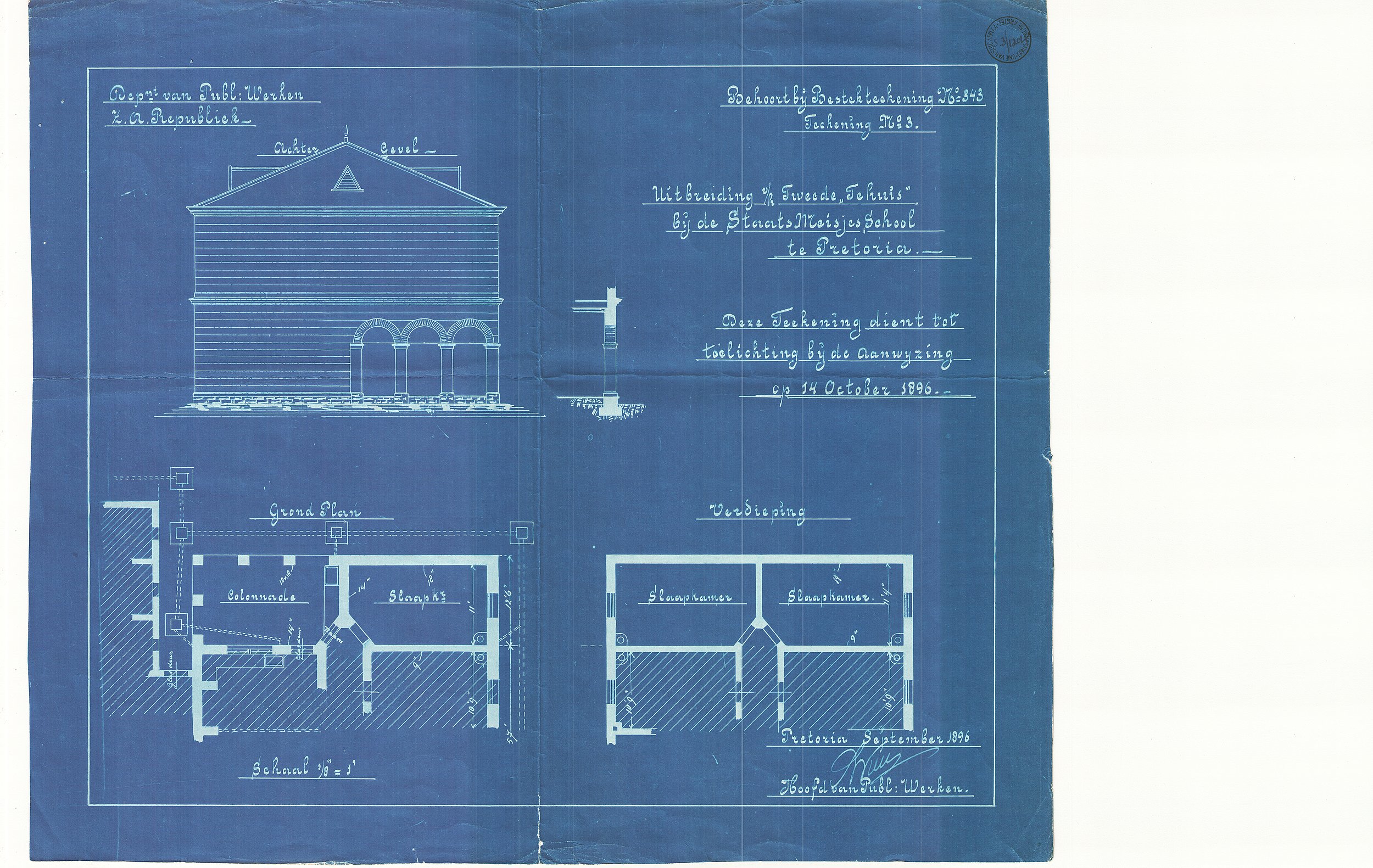 Digitised version of National Archive file S.3/1204. "Grondplan, Verdieping" (Ground Plan, Storey) of additions to the second building, Staats Meisjesschool, Pretoria, signed by "S.W. Wierda, Hoofd van Publ. Werken"