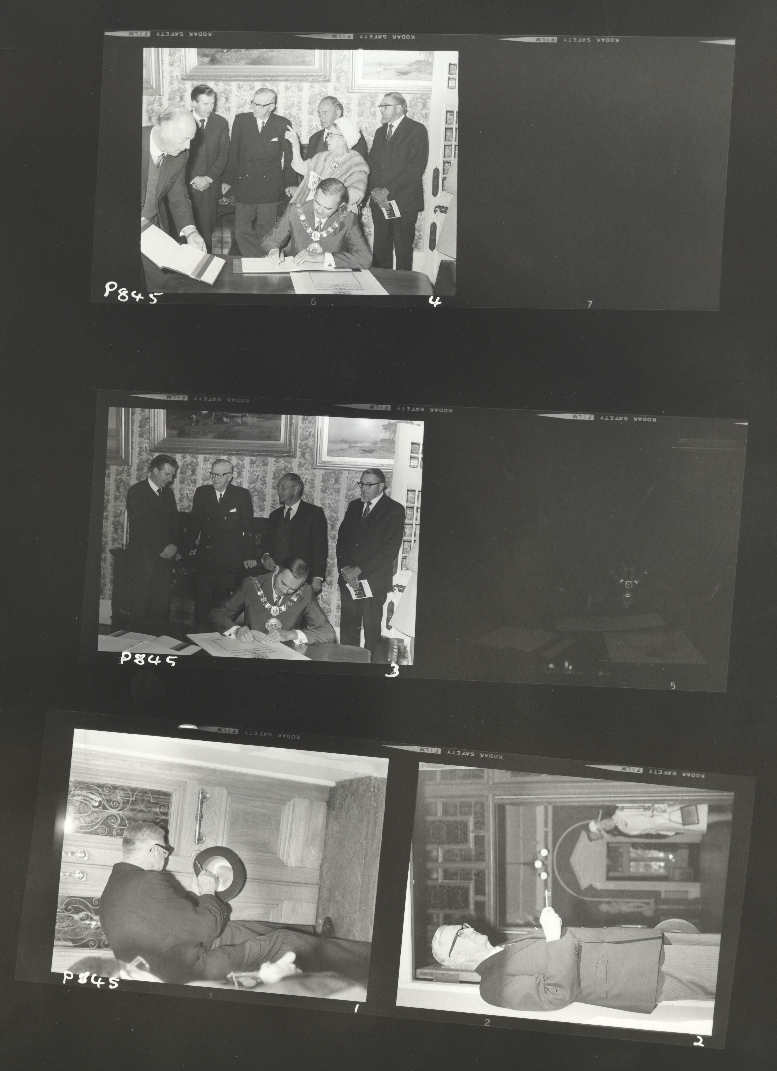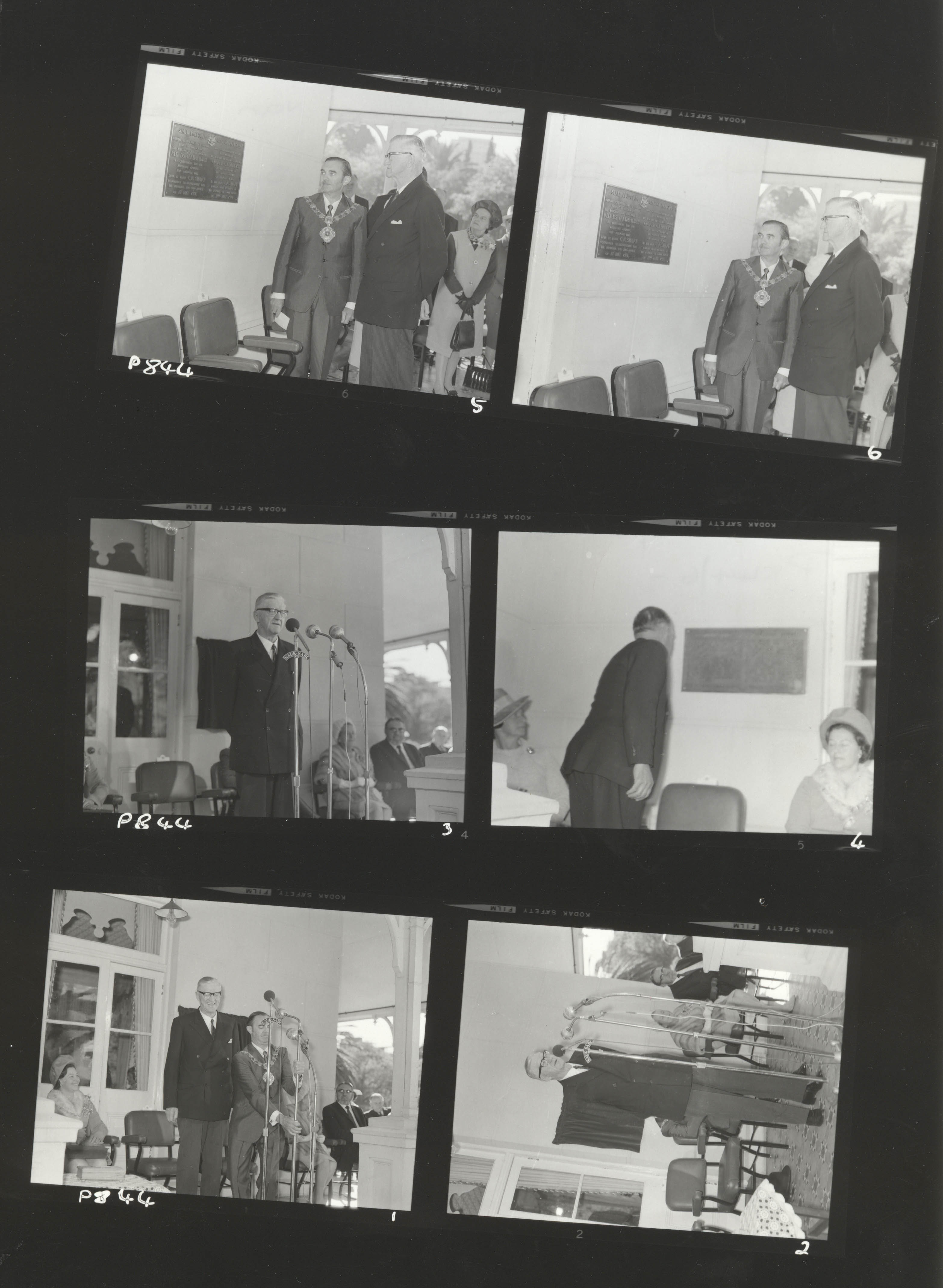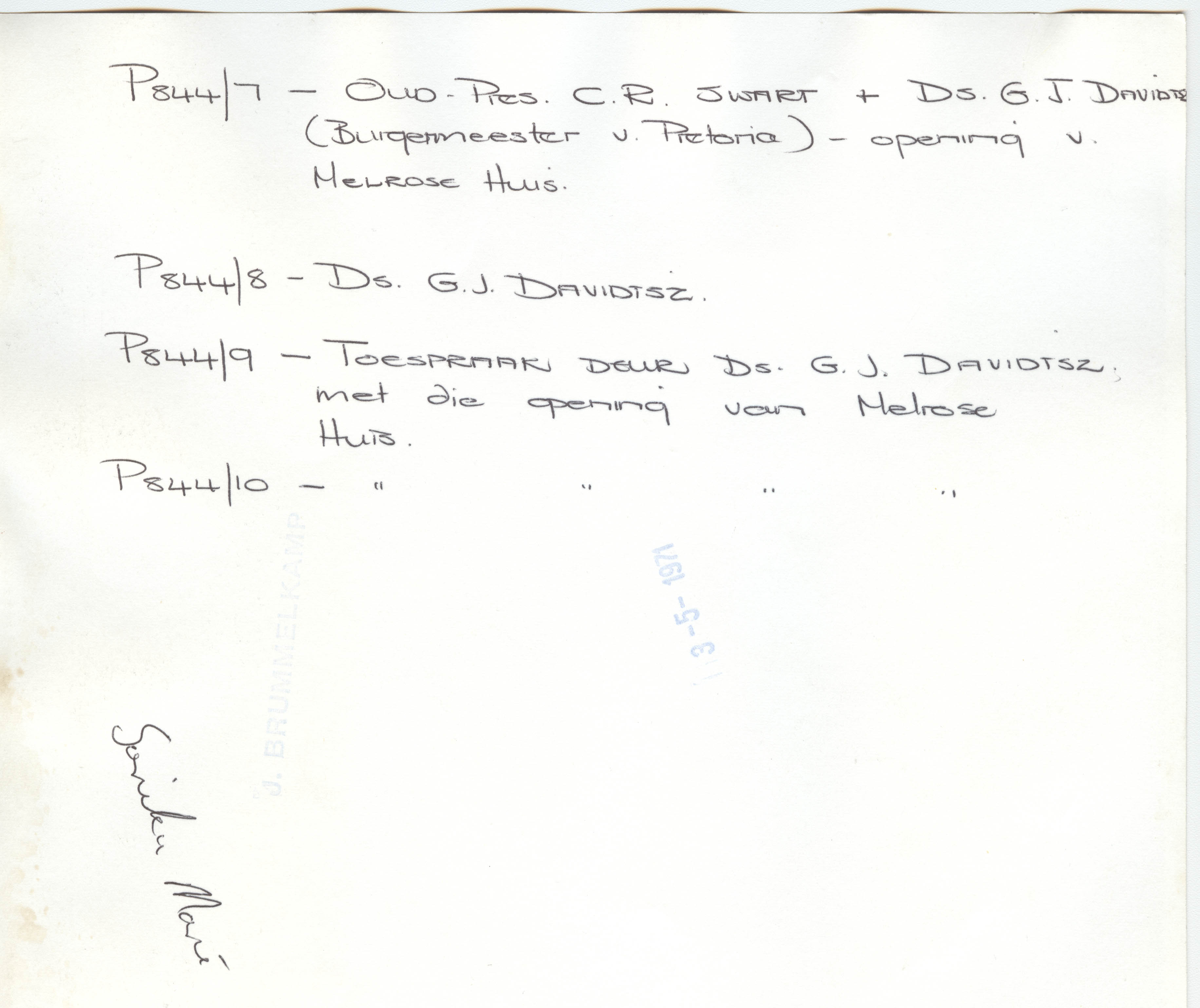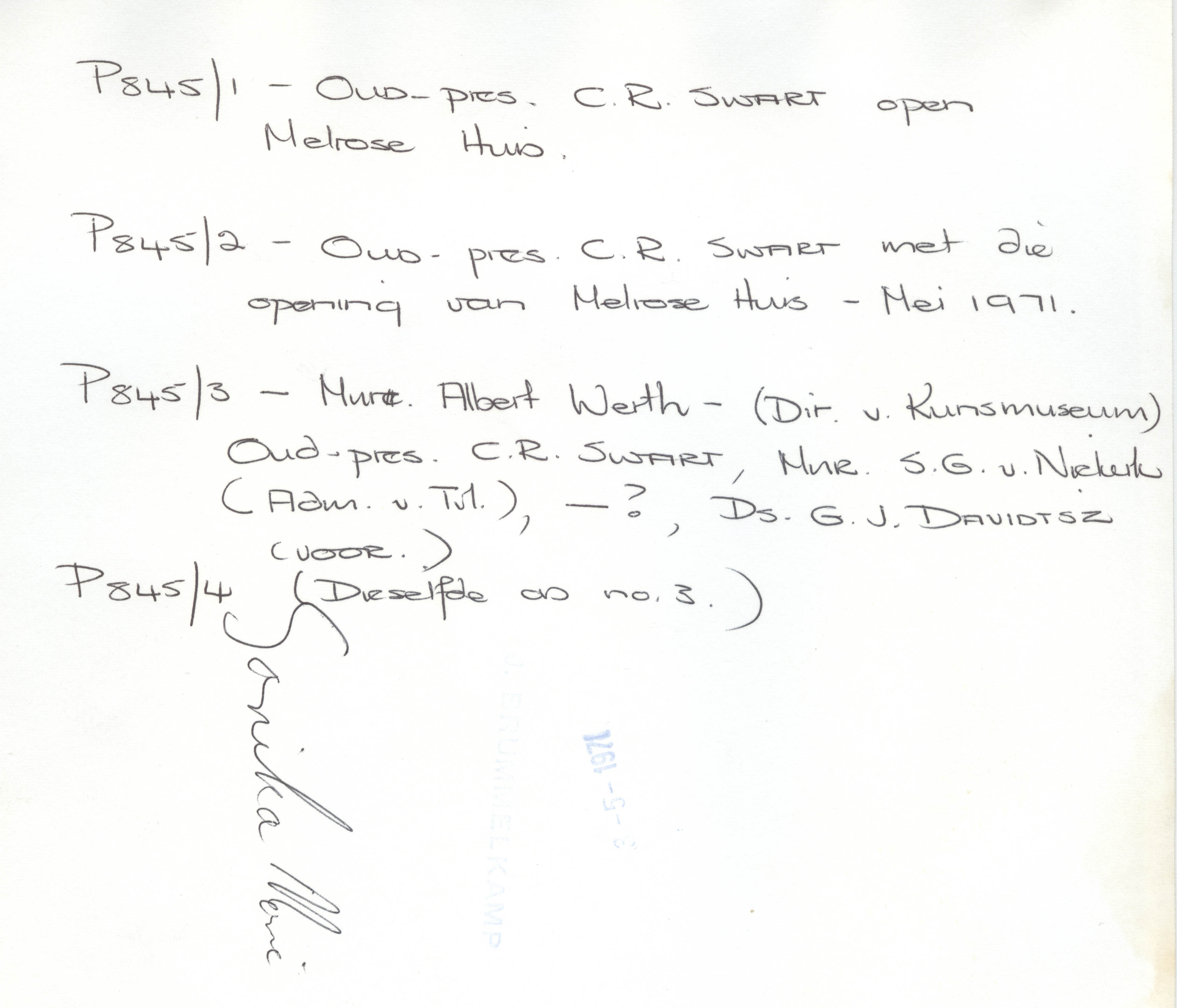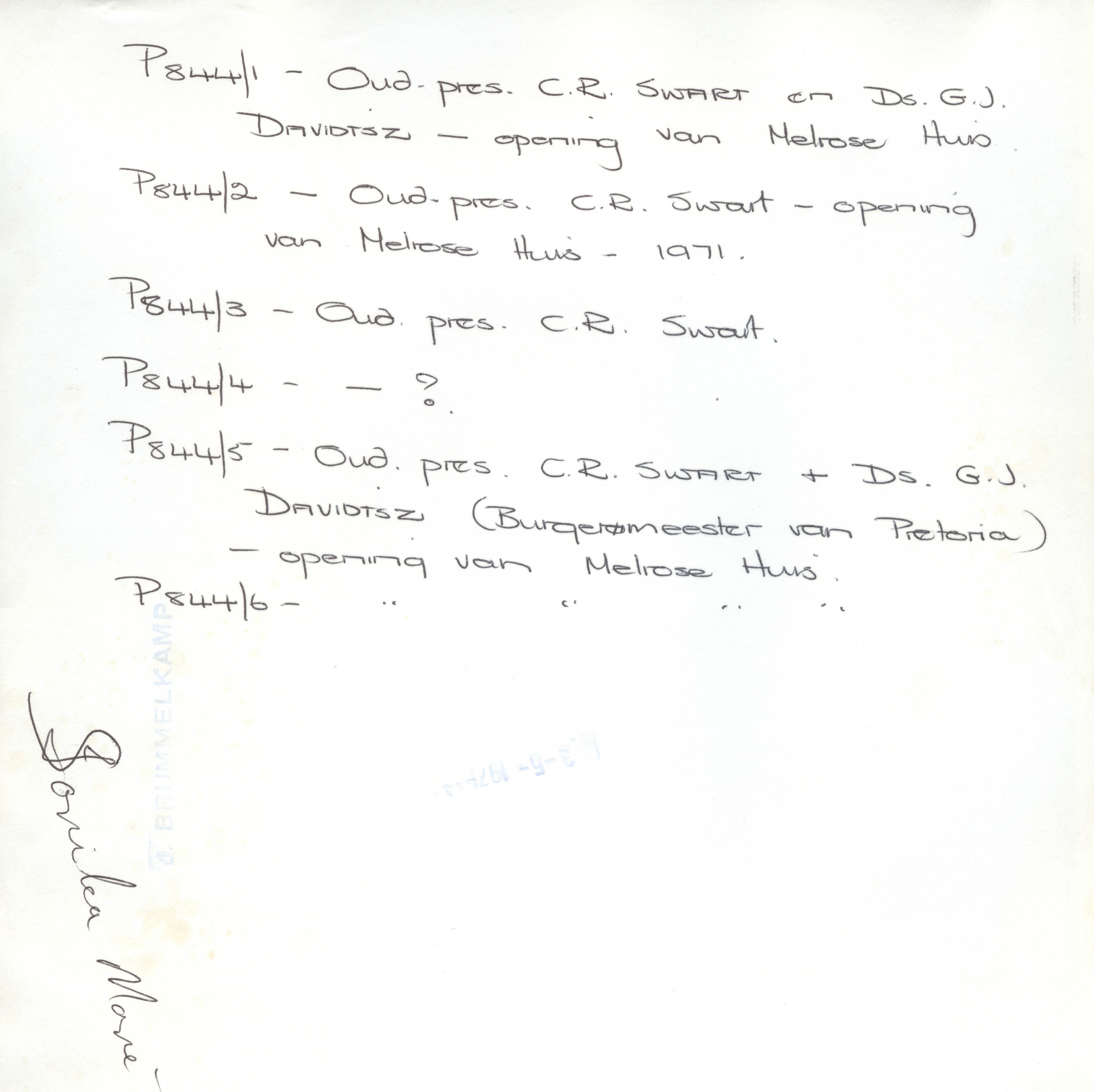 Slide images (and their reverse sides) of C.R. Swart, Albert Werth, S.G. van Niekerk and G.J. Davidtsz at the opening of Melrose House in 1971.