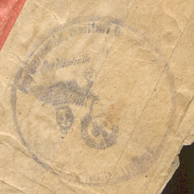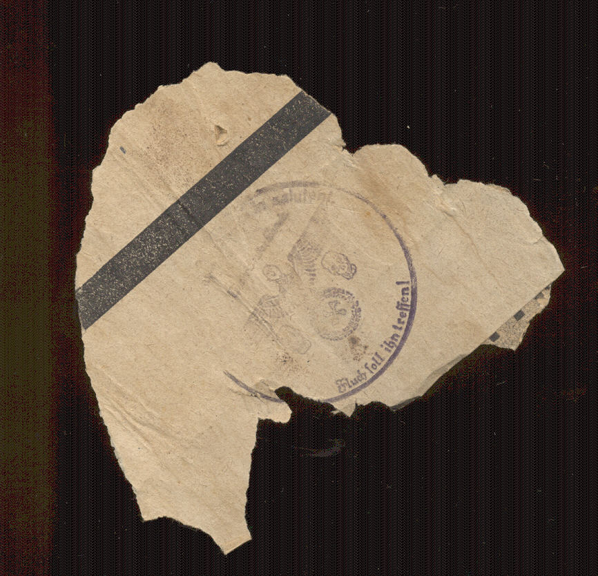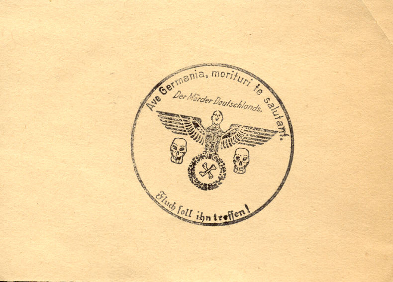 Illegal Stamp stamped on the German propaganda and mass media during April 1945.The inscription "Ave Germania morituri te salutant, Der Morder Deutschlands, Fluch soll ihm treffen!" can be translated as "Hail Germany, those who are about to die salute you, the destroyers of Germany, a curse will fall on you.