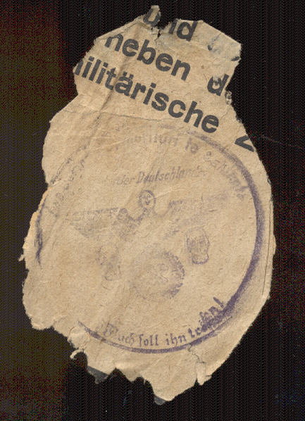 5 ink stamps stamped on pieces of poster. The stamp is round and inscribed "Ave Germania morituri te salutant, Der Morder Deutschlands, Fluch soll ihm treffen!". In the centre is the German eagle with Hitler’s head and the swastika is replaced with crossed bones. Scanned on HP5300C scanner at 150dpi.