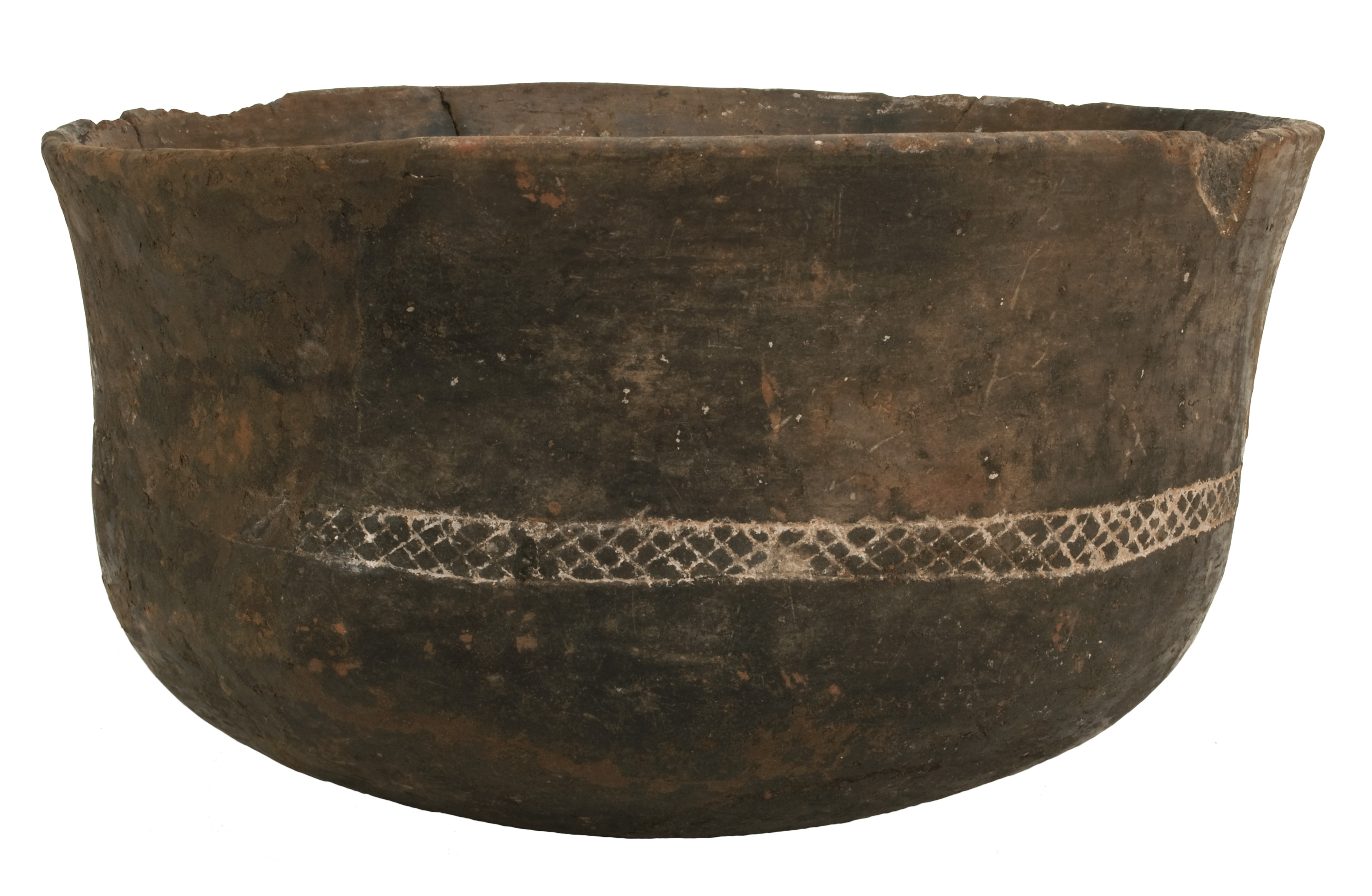This decorated beaker bowl is typical of the K2 ceramic tradition. The base is rounded with a slightly flared and everted rim, and a single band incised cross-hatched decorations runs the circumference of the vessel. This low-fired vessel is porous eathenware and polished smooth on the interior and exterior with black rubbing stone, usually a river pebble.